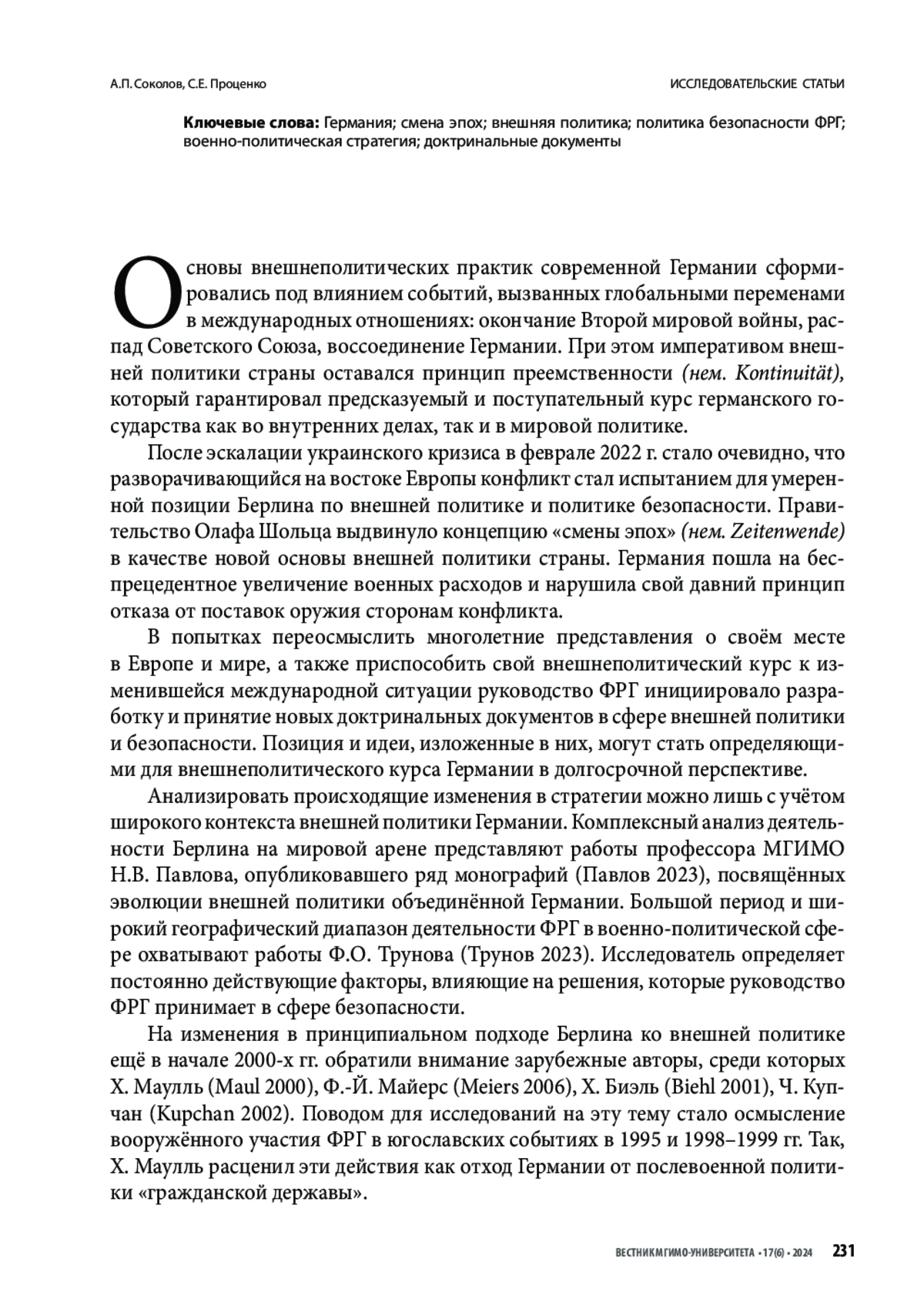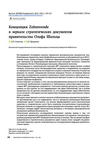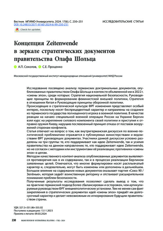 СОКОЛОВ А. П., ПРОЦЕНКО С. Е. КОНЦЕПЦИЯ ZEITENWENDE В ЗЕРКАЛЕ СТРАТЕГИЧЕСКИХ ДОКУМЕНТОВ ПРАВИТЕЛЬСТВА ОЛАФА ШОЛЬЦА // ВЕСТНИК МГИМО-УНИВЕРСИТЕТА. 2024. ТОМ 17, № 6