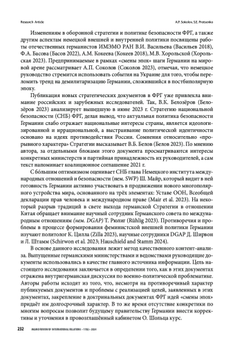 Исследование посвящено анализу германских доктринальных документов, опубликованных правительством Олафа Шольца в контексте объявленной им в 2022 г. «смены эпох», среди которых: Стратегия национальной безопасности, Руководящие принципы по формированию феминистской внешней политики, Стратегия в отношении Китая и Руководящие принципы оборонной политики. Происходящие в стратегической культуре ФРГ изменения представляют особый интерес, поскольку носят беспрецедентный характер и направлены на создание из германского государства полноценного игрока в военной политике. В качестве реакции на начало специальной военной операции России на Украине Берлин взял курс на укрепление силового компонента своей политики и приступил к отправке оружия Киеву, нарушив послевоенный принцип отказа от поставок вооружений сторонам конфликта. Статья отвечает на вопрос о том, как внутригерманская дискуссия по военно-политической проблематике отражается в публикуемых министерствами и ведомствами ФРГ руководящих документах. Участники данной дискуссии условно разделены на три группы: те, кто поддерживает как идею Zeitenwende, так и усилия правительства на данном направлении; те, кто поддерживает идею Zeitenwende, но не согласен с методами или инструментами её реализации; противники «смены эпох» в целом. Методом качественного контент-анализа опубликованных документов выявляются противоречия как в их содержании, так и в процессах реализации Берлином заявленных целей. Отмечается, что многие формулировки носят расплывчатый характер и, следовательно, могут быть изменены или дополнены в дальнейшем. Большое влияние на содержание новых документов оказывает партия «Союз 90 / Зелёные», которая задаёт воинственную риторику и отстаивает расширительное понимание проблем безопасности. Полученные результаты исследования позволяют сделать вывод о том, что на практике германский подход более сбалансирован и осторожен, чем артикулируемые руководством ФРГ внешнеполитические установки. Тем не менее, сам факт закрепления в стратегических документах идей «смены эпох» придаёт им долгосрочный характер и делает невозможным их игнорирование будущим правительством страны.