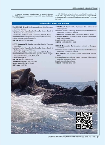 36. Inzarcev A.V., Pavin A.M., Eliseenko G.D, Rod’kin D.N., Sidorenko A.V., Lebedko O.A., Panin M.A. Rekonfiguriruemaya krossplatformennaya sreda modelirovaniya povedeniya neobitaemogo podvodnogo apparata // Podvodnye issledovaniya i robototekhnika. 2015. № 2(20). P. 28-34. [In Russ.].