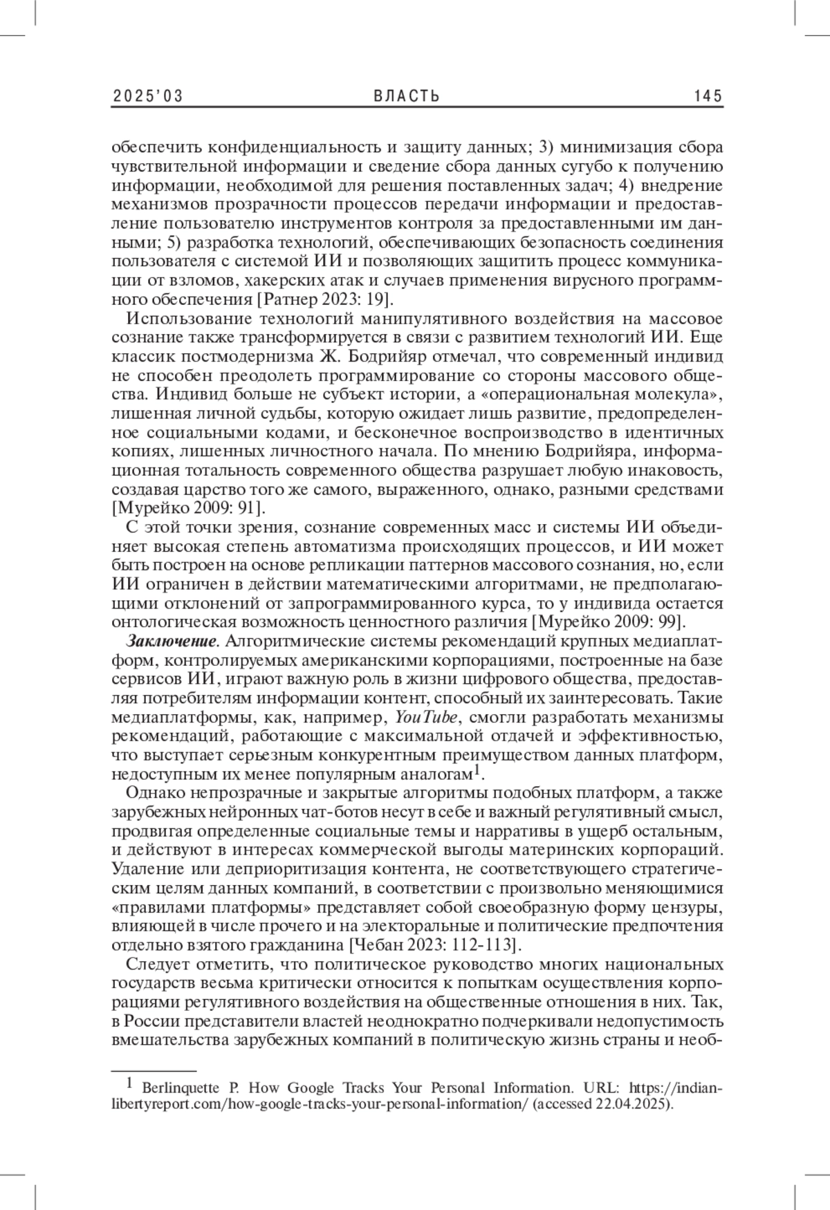 4. Ратнер Н.П. 2023. Проблема приватности и защиты данных в контексте искусственного интеллекта, вопросы этики. - Universum: экономика и юриспруденция. № 12(110). С. 18-20. EDN: IPKBPO