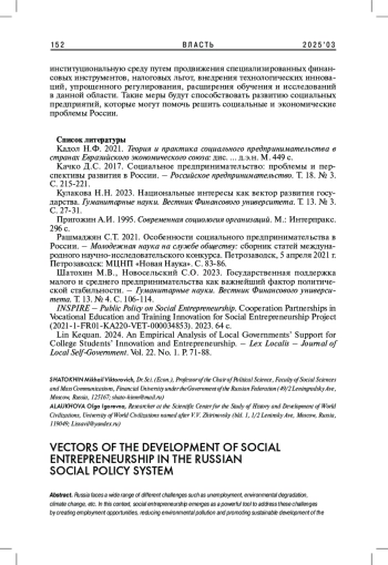 5. Рашмаджян С.Т. 2021. Особенности социального предпринимательства в России. - Молодежная наука на службе обществу: сборник статей международного научно-исследовательского конкурса. Петрозаводск, 5 апреля 2021 г. Петрозаводск: МЦНП “Новая Наука”. С. 83-86. EDN: HOETZC