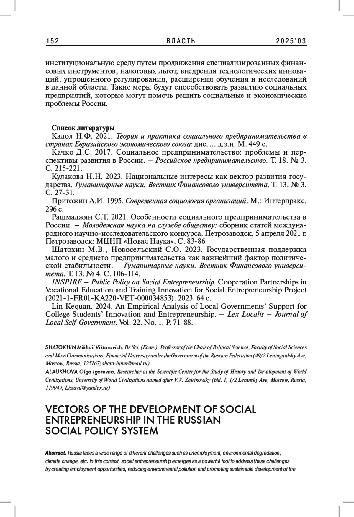 2. Качко Д.С. 2017. Социальное предпринимательство: проблемы и перспективы развития в России. - Российское предпринимательство. Т. 18. № 3. С. 215-221. EDN: YGAGUD