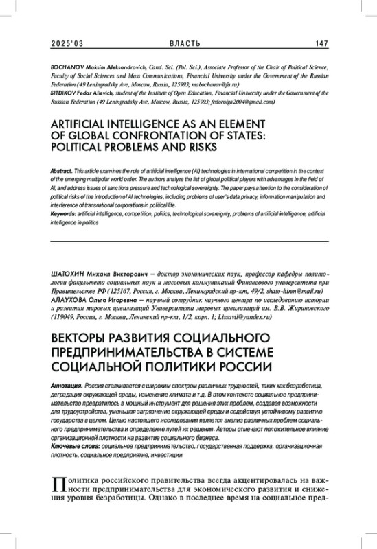 В данной статье исследуется роль технологий искусственного интеллекта (ИИ) в международной конкуренции в условиях формирующегося многополярного миропорядка. Авторы анализируют перечень игроков мировой политики, обладающих преимуществами в сфере ИИ, а также затрагивают вопросы санкционного давления и технологического суверенитета, уделяя внимание рассмотрению политических рисков внедрения технологий ИИ, включающих в себя проблемы приватности пользовательских данных, информационных манипуляций и вмешательства транснациональных корпораций в политическую жизнь.