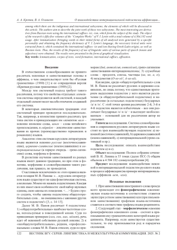 В русском языке встречаются не только заимствованные лексические единицы (иноязычные слова), но также и отвлекаемые от них интернациональные морфемы (аффиксы), участвующие в словообразовании. Есть два этапа, которые могут проходить заимствованные слова: фонографическое и морфологическое освоения. Первое происходит при звуковом или визуальном восприятии лексической единицы. При втором же этапе ей приписываются уже некие грамматические характеристики, свойственные языку, в который слово было заимствовано. Также поднимается проблема нечленимости заимствованных основ и как они становятся частью русской словообразовательной системы в статусе радикса. Система аффиксации русского языка состоит из нескольких взаимодействующих друг с другом подсистем, среди которых есть исконная и интернациональная подсистемы, элементы которых будут рассмотрены в этой статье. Авторы ставят перед собой цель описать совместную работу этих двух подсистем. Наибольший интерес вызывают дериваты от русских корней с использованием интернациональных суффиксов -ист, -изм, составляющие предмет исследования. Объектом исследования являются пятьдесят пять томов «Полного собрания сочинений» В. И. Ленина общим объемом в 4 504 182 словоупотребления. После проведения лемматизации (приведения слов к их начальной форме) всех анализируемых текстов, порожденных конкретной личностью, и получения частотного словаря языка В. И. Ленина из него были извлечены необходимые лексические единицы, которые содержали интернациональные суффиксы - ист и - изм (имеющие греко-латинское происхождение), а также русские корни. Таким образом, были получены результаты частотности употребления языковых единицы различных частей речи (имена существительные и прилагательные). Результаты были представлены в виде графической визуализации.