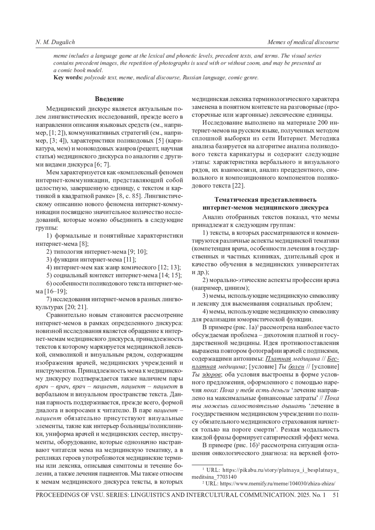ДУГАЛИЧ Н. М. МЕМЫ МЕДИЦИНСКОГО ДИСКУРСА // ВЕСТНИК ВОРОНЕЖСКОГО ГОСУДАРСТВЕННОГО УНИВЕРСИТЕТА. СЕРИЯ: ЛИНГВИСТИКА И МЕЖКУЛЬТУРНАЯ КОММУНИКАЦИЯ. 2025. № 1