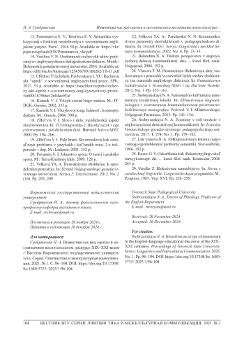 26. Сребрянская Н. А. Зоонимы в роли инвектив в англоязычной деструктивной коммуникации // Изв. Воронеж, гос. пед. ун-та. 2017. Т. 274, № 1. С. 179-182.