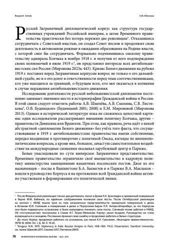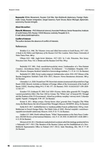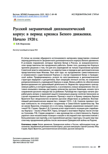 В статье на основе обширного источникового материала представлен сложный период деятельности Заграничного дипломатического корпуса Белого движения. В условиях поражений, которые терпели белые в России, их внешнеполитическое представительство продолжало работать. Более того, руководство Корпуса приняло решение о том, что для его учреждений не только подчинение органам Советской власти невозможно, но недопустима и передача дел дипломатическим представительствам Москвы. Был взят курс на продолжение самостоятельного и независимого существования Корпуса в случае поражения белых в Гражданской войне. Предпринимались усилия по восстановлению в дипломатической структуре иерархии и дисциплины. Был сокращён личный состав, но сохранена репрезентативность учреждений Корпуса в мире. Велась работа по обеспечению финансирования его дальнейшей деятельности. Ведомство продолжало повседневную работу, в которой выделились и усиливались новые направления. Оно активно оказывало помощь растущему количеству русских беженцев, искало пути сохранения русского имущества за рубежом. Руководство структуры начало разрабатывать вопрос о правовой защите покинувших родину соотечественников на случай поражения Белого движения. Приход к власти в Крыму генерала барона Врангеля был неоднозначно встречен русским обществом за рубежом. Возглавлявший дипломатическое ведомство с января 1919 г. С. Д. Сазонов проявил полную лояльность по отношению к созданному в Севастополе правительству. Тем не менее Врангель отправил его в отставку, передав управление внешней политикой П. Б. Струве. Однако С. Д. Сазонов успел подготовить позиции для старейшины Корпуса – посла в Риме М. Н. Гирса, который и возглавил Корпус после отставки Сазонова. П. Б. Струве разделил с ним руководство и ответственность. Корпус укрепил свои независимые позиции и вошёл в последний этап противостояния с большевиками как партнёр, а не подчинённая центру структура, что дало ему перспективу продолжения работы после окончания Гражданской войны на Родине.
