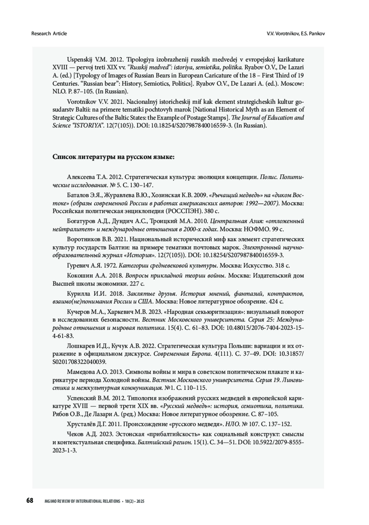 32. Воротников В.В. 2021. Национальный исторический миф как элемент стратегических культур государств Балтии: на примере тематики почтовых марок. Электронный научнообразовательный журнал «История». 12(7(105)). https://doi.org/10.18254/S207987840016559-3.