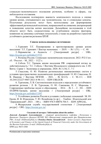 6. Турганова, Л. В. Систематизация подходов к определению устойчивого развития региона / Л. В. Турганова, О. Ю. Савенкова, Н. С. Морозова // Современные проблемы науки и образования. - 2014. - № 3. - С. 381. Уровень жизни населения // [Электронный ресурс] - URL: https://rosstat.gov.ru/folder/13397. EDN: SYZPFH