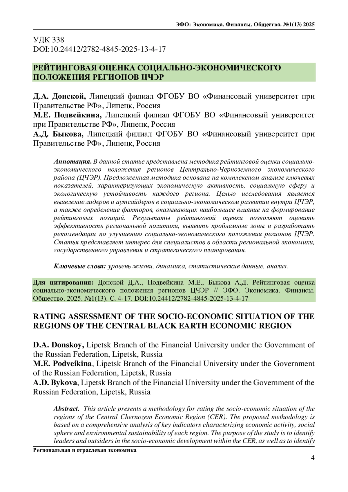 В данной статье представлена методика рейтинговой оценки социальноэкономического положения регионов Центрально-Черноземного экономического района (ЦЧЭР). Предложенная методика основана на комплексном анализе ключевых показателей, характеризующих экономическую активность, социальную сферу и экологическую устойчивость каждого региона. Целью исследования является выявление лидеров и аутсайдеров в социально-экономическом развитии внутри ЦЧЭР, а также определение факторов, оказывающих наибольшее влияние на формирование рейтинговых позиций. Результаты рейтинговой оценки позволяют оценить эффективность региональной политики, выявить проблемные зоны и разработать рекомендации по улучшению социально-экономического положения регионов ЦЧЭР. Статья представляет интерес для специалистов в области региональной экономики, государственного управления и стратегического планирования.