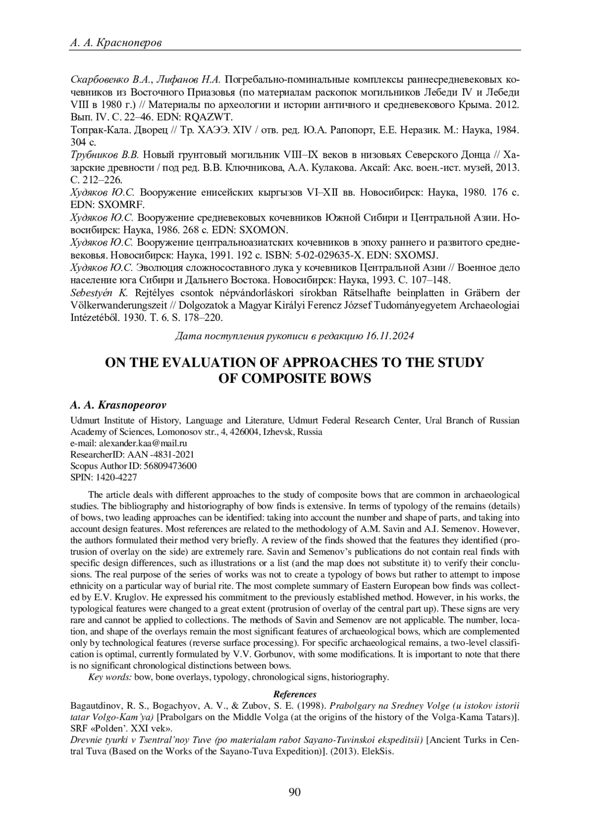 16. Круглов Е.В. Сложносоставные луки Восточной Европы хазарского времени // II Городцовские чтения: материалы науч. конф., посвящ. 100-летию деятельности В.А. Городцова в ГИМ, Москва, апрель 2003 г. / Тр. ГИМ. Вып. 125 / отв. ред. И.В. Белоцерковская. М.: ГИМ, 2005b. С. 307-320. EDN: DYEWUX