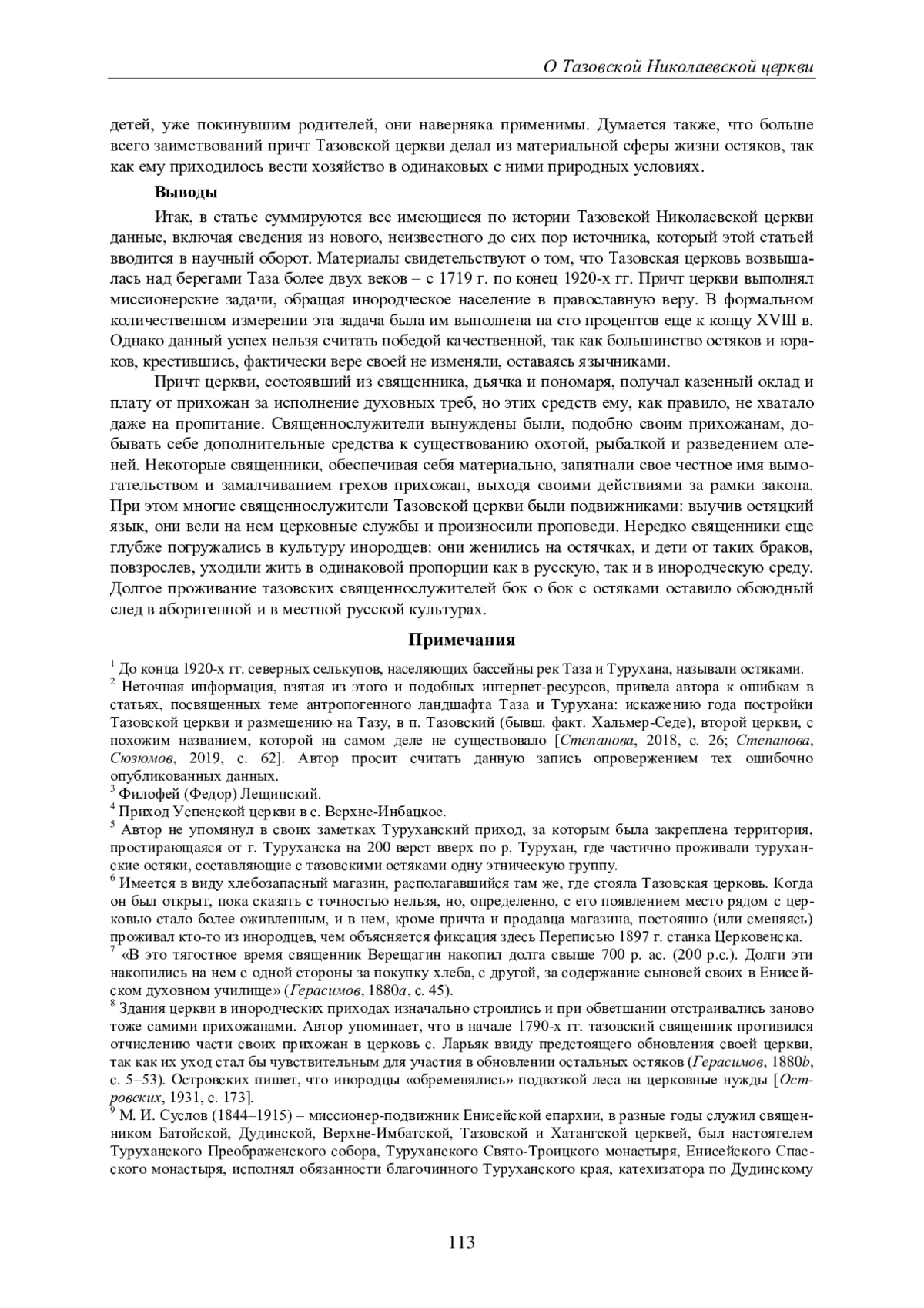 Поводом к изучению истории Тазовской Николаевской церкви послужило одно событие. В декабре 2023 г. Дума Красноселькупского района Ямало-Ненецкого автономного округа приняла решение считать датой основания районного центра села Красноселькуп не 1937 г., как признавалось ранее, а 1897 г., когда статистическая перепись населения народов России зафиксировала рядом с Тазовской Николаевской церковью станок Церковенск (Об установлении даты…, 2023, с. 6). Для справки: Тазовская Николаевская церковь и поселок при ней располагались на берегу р. Таз в 20 км выше устья р. Худосей; расстояние от Церковенска до Красноселькупа составляло 40 км вниз по Тазу.