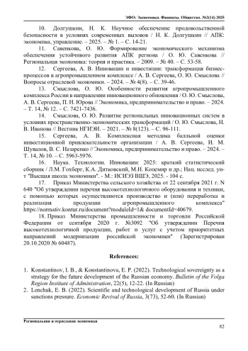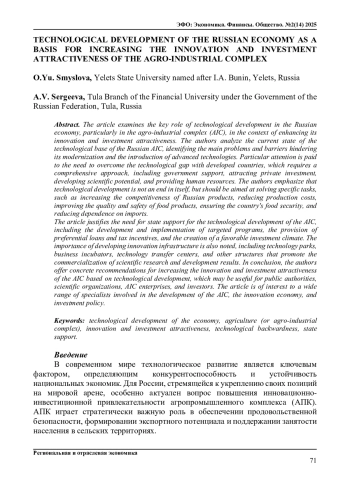 СМЫСЛОВА О. Ю., СЕРГЕЕВА А. В. ТЕХНОЛОГИЧЕСКОЕ РАЗВИТИЕ ЭКОНОМИКИ РОССИИ КАК ОСНОВА ПОВЫШЕНИЯ ИННОВАЦИОННО-ИНВЕСТИЦИОННОЙ ПРИВЛЕКАТЕЛЬНОСТИ АПК // ЭФО: ЭКОНОМИКА. ФИНАНСЫ. ОБЩЕСТВО. 2025. № 2 (14)