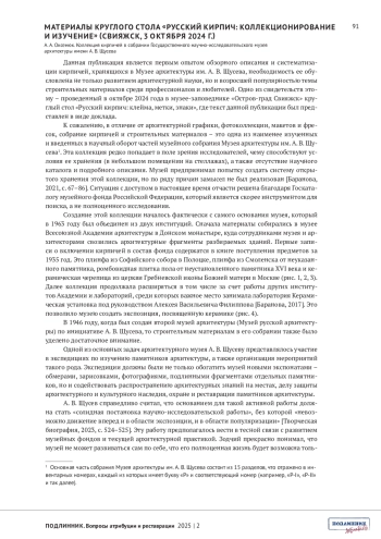 Государственный научно-исследовательский музей архитектуры имени А. В. Щусева (далее – Музей архитектуры им. А. В. Щусева), которому в 2024 году исполнилось 90 лет, является крупнейшим в стране собранием предметов архитектурной тематики, общее количество которых приближается к 840 тысячам. Среди них относительно небольшую, но важную часть составляет коллекция керамики и строительных материалов. Она состоит из изразцов, строительных растворов, а также около тысячи кирпичей самого разного времени от XI века до настоящего времени.