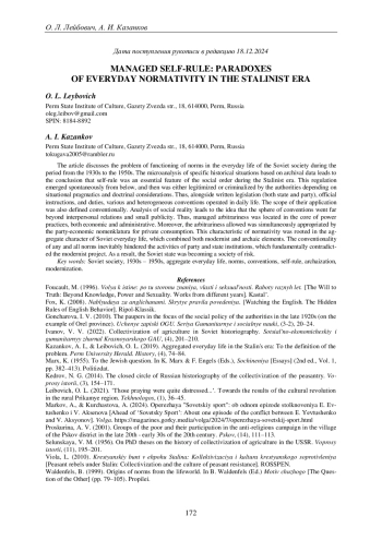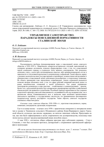 ЛЕЙБОВИЧ О. Л., КАЗАНКОВ А. И. УПРАВЛЯЕМОЕ САМОУПРАВСТВО: ПАРАДОКСЫ ПОВСЕДНЕВНОЙ НОРМАТИВНОСТИ СТАЛИНСКОЙ ЭПОХИ // ВЕСТНИК ПЕРМСКОГО УНИВЕРСИТЕТА. ИСТОРИЯ. 2025. № 1 (68)