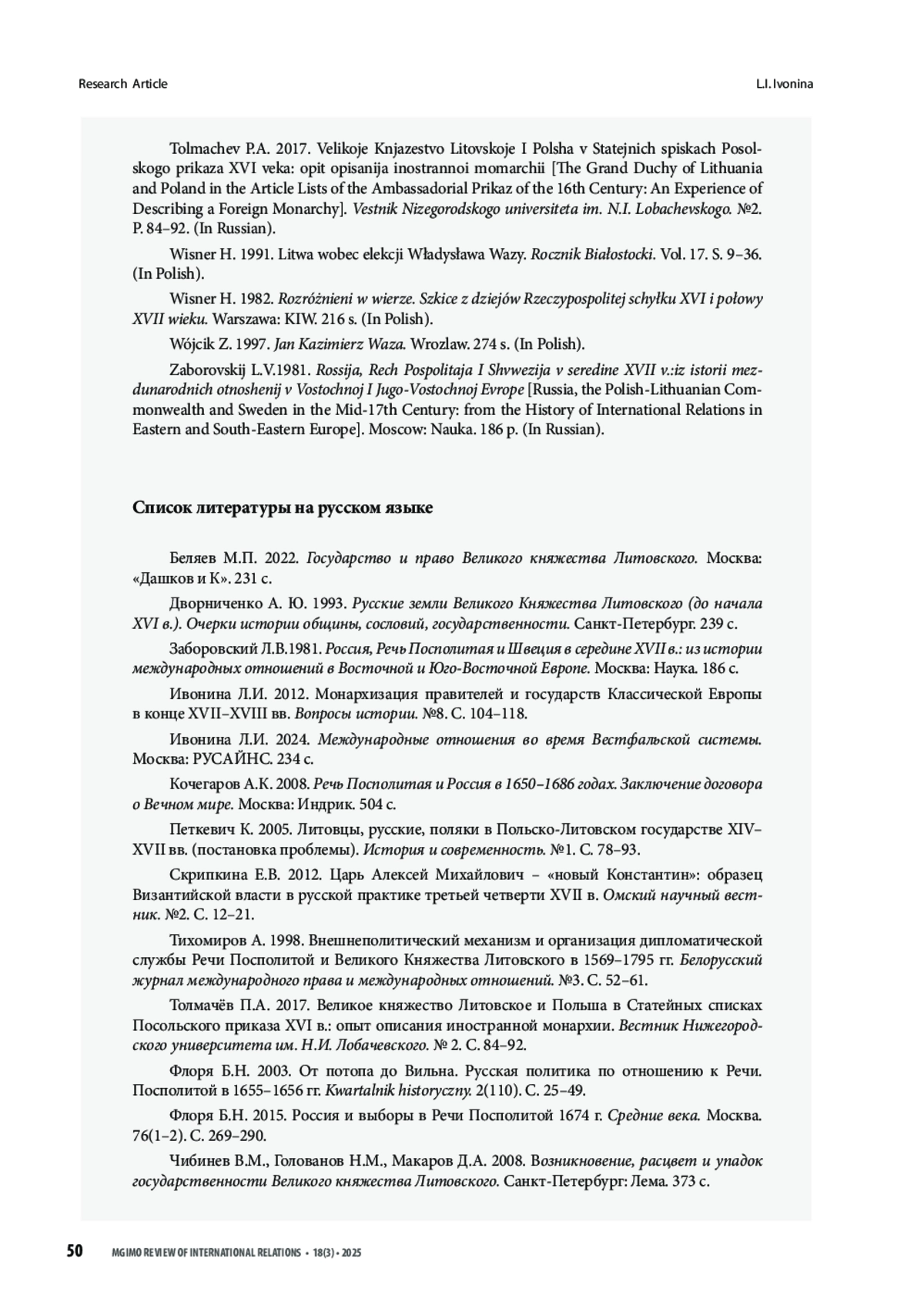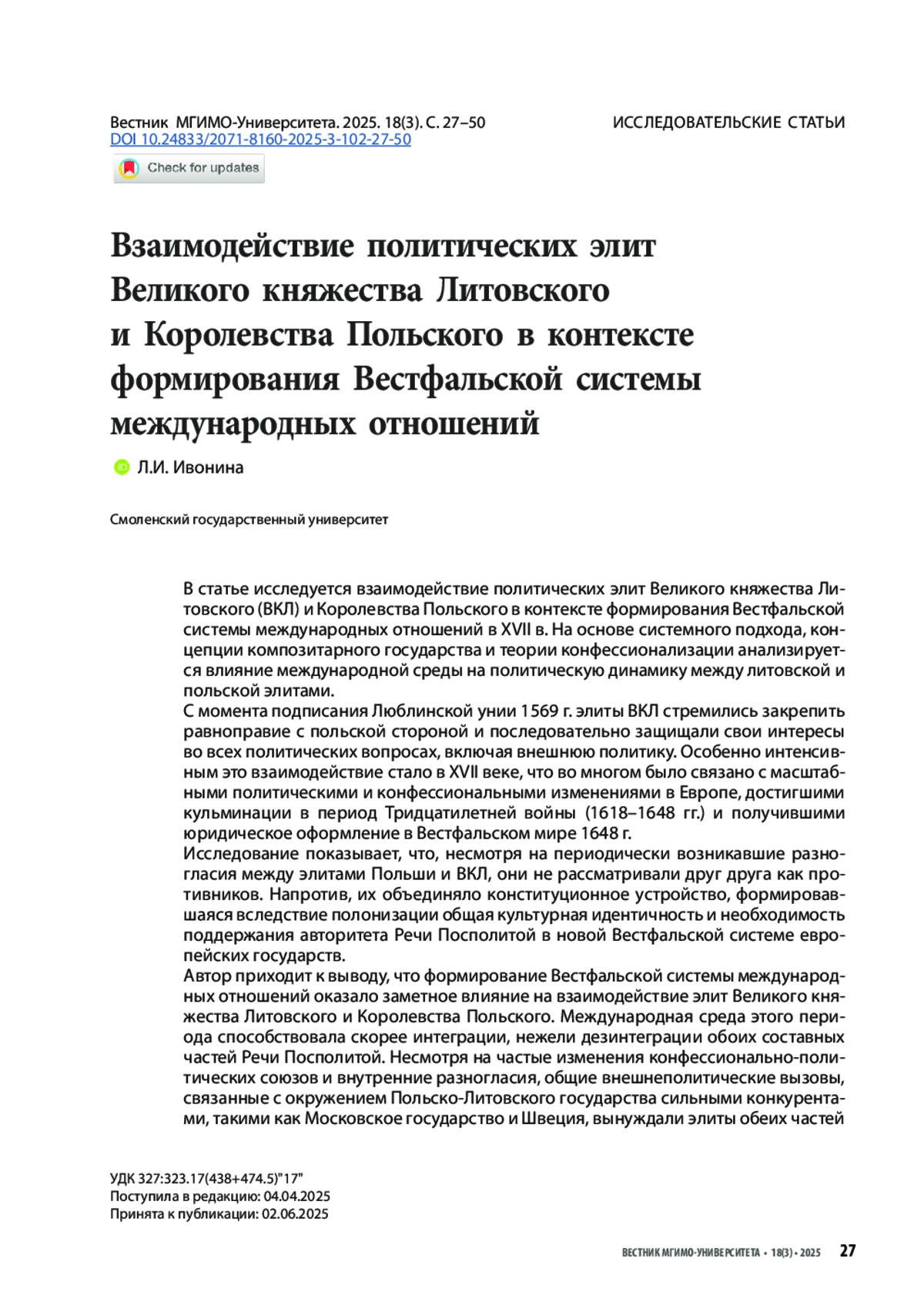 В статье исследуется взаимодействие политических элит Великого княжества Литовского (ВКЛ) и Королевства Польского в контексте формирования Вестфальской системы международных отношений в XVII веке. На основе системного подхода, концепции композитарного государства и теории конфессионализации анализируется влияние международной среды на политическую динамику между литовской и польской элитами. С момента подписания Люблинской унии 1569 г. элиты ВКЛ стремились закрепить равноправие с польской стороной и последовательно защищали свои интересы во всех политических вопросах, включая внешнюю политику. Особенно интенсивным это взаимодействие стало в XVII веке, что во многом было связано с масштабными политическими и конфессиональными изменениями в Европе, достигшими кульминации в период Тридцатилетней войны (1618–1648 гг.) и получившими юридическое оформление в Вестфальском мире 1648 года. Исследование показывает, что, несмотря на периодически возникавшие разногласия между элитами Польши и ВКЛ, они не рассматривали друг друга как противников. Напротив, их объединяло конституционное устройство, формировавшаяся вследствие полонизации общая культурная идентичность и необходимость поддержания авторитета Речи Посполитой в новой Вестфальской системе европейских государств. Автор приходит к выводу, что формирование Вестфальской системы международных отношений оказало заметное влияние на взаимодействие элит Великого княжества Литовского и Королевства Польского. Международная среда этого периода способствовала скорее интеграции, нежели дезинтеграции обоих составных частей Речи Посполитой. Несмотря на частые изменения конфессионально-политических союзов и внутренние разногласия, общие внешнеполитические вызовы, связанные с окружением Польско-Литовского государства сильными конкурентами, такими как Московское государство и Швеция, вынуждали элиты обеих частей стремиться к согласованию интересов и укреплению единства. Таким образом, международные процессы середины XVII века выступали в качестве важного внешнего фактора, определявшего характер политического взаимодействия польской и литовской элит и способствовавшего усилению внутренней консолидации Речи Посполитой в новых реалиях Вестфальского порядка.