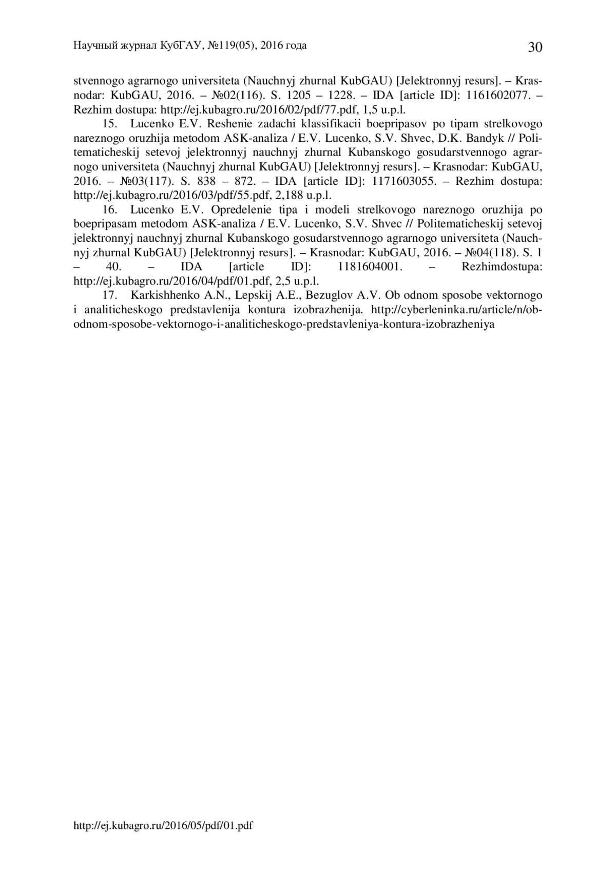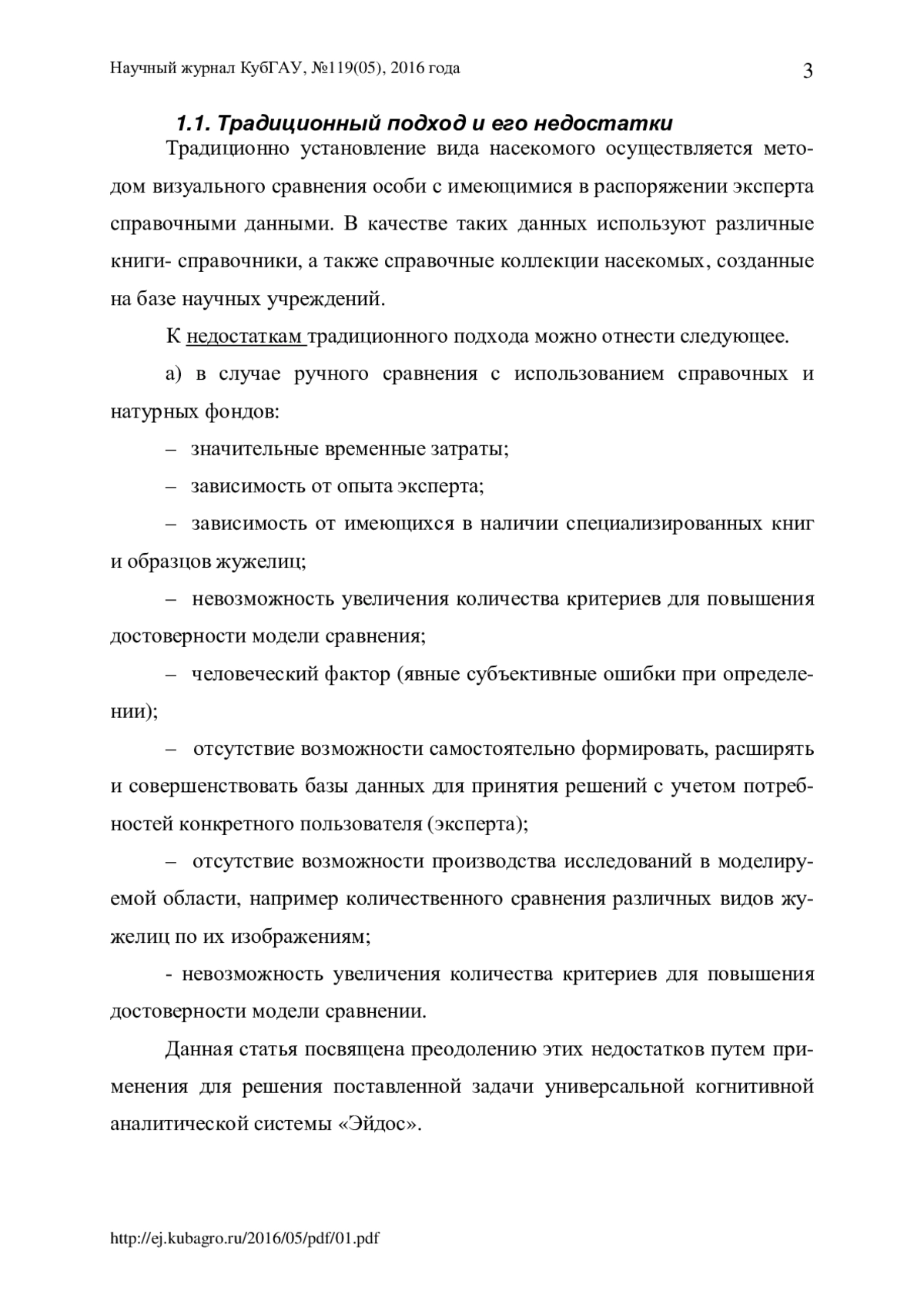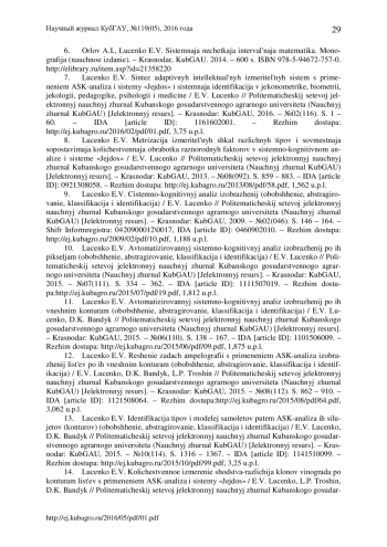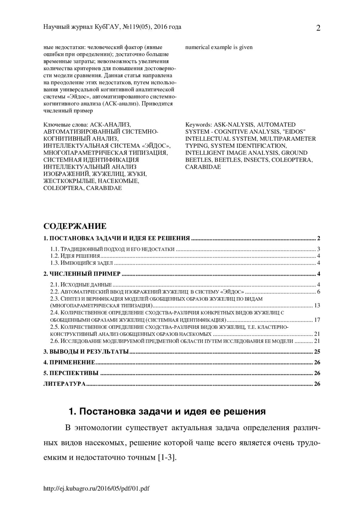 Насекомые являются важнейшим компонентом естественных биоценозов и агроценозов. Одним из самых больших и многочисленных семейств - являются жужелицы (Carabidae), насчитывающие по разным данным более 30000 видов. Для жужелиц характерны различные способы питания, местообитания, занимаемые яруса, сезонная и суточная активность. Они обитают как на поверхности, так и в почве, реже на кустарниках и деревьях. Виды семейства жужелицы - активные жуки с длинными тонкими антеннами равномерной толщины, длинными надкрыльями и длинными ногами, приспособленными к беганию. Размеры их варьируют от нескольких миллиметров до 10 см. Являясь активными хищниками, жужелицы играют огромное практическое значение, уничтожая вредителей еще до достижения последними порога вредоносности, тем самым обеспечивая их естественную регуляцию. Исходя из того, что количество жужелиц велико, а размеры их иногда составляют всего несколько миллиметров, возникла проблема определения вида этих насекомых (или их идентификации), вследствие чего потребовался специальный инструмент, который, с одной стороны, упростил бы получение данных об этих насекомых, а с другой стороны, повысил бы их точность. В данной статье предлагается новый для данной предметной области подход к идентификации различных видов жужелиц по их внешнему контуру с применением программного инструментария автоматизированного системно-когнитивного анализа (АСК-анализ) - универсальной когнитивной аналитической системы «Эйдос», которая прекрасно себя зарекомендовала при изучении других объектов. Причина, по которой было решено использовать эту систему, состоит в том, что обычные (стандартные) способы определения жужелиц, имеют определенные недостатки: человеческий фактор (явные ошибки при определении); достаточно большие временные затраты; невозможность увеличения количества критериев для повышения достоверности модели сравнения. Данная статья направлена на преодоление этих недостатков, путем использования универсальной когнитивной аналитической системы «Эйдос», автоматизированного системно-когнитивного анализа (АСК-анализ). Приводится численный пример.