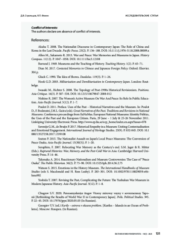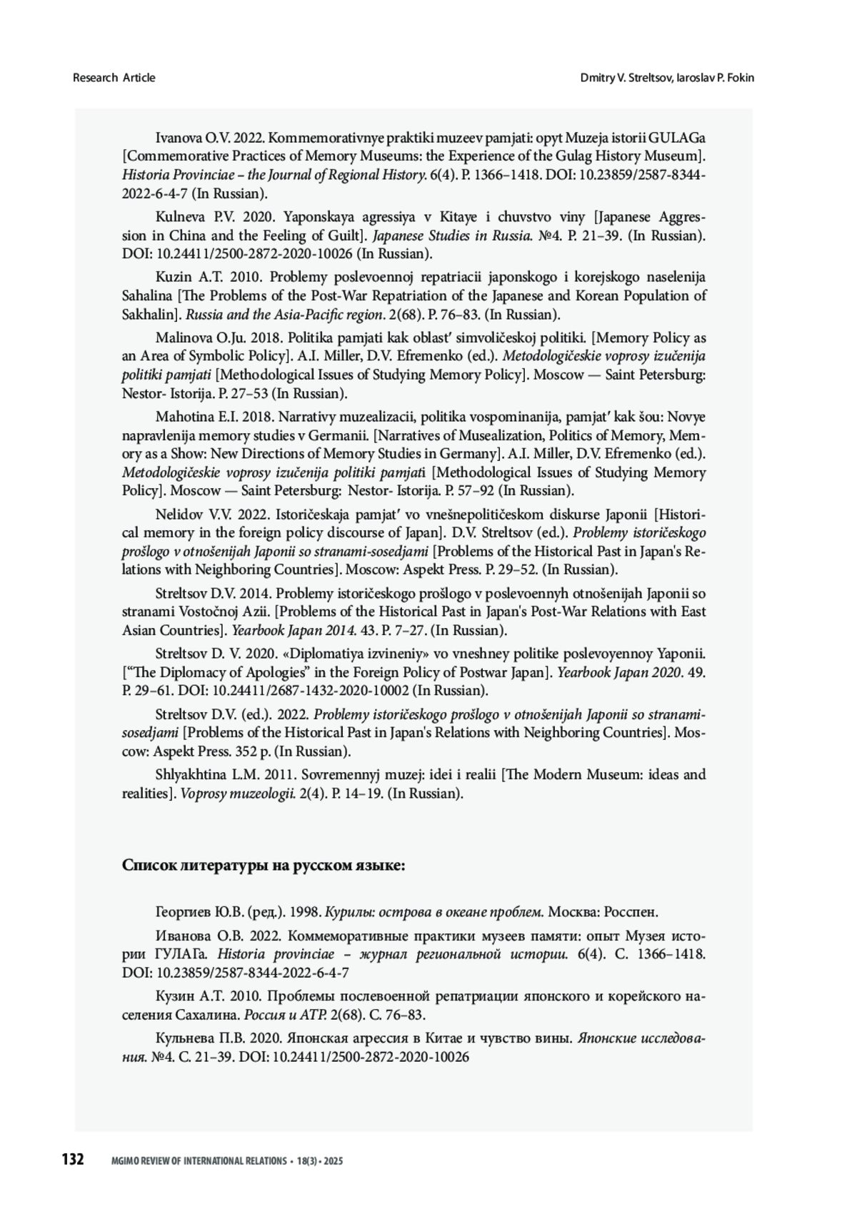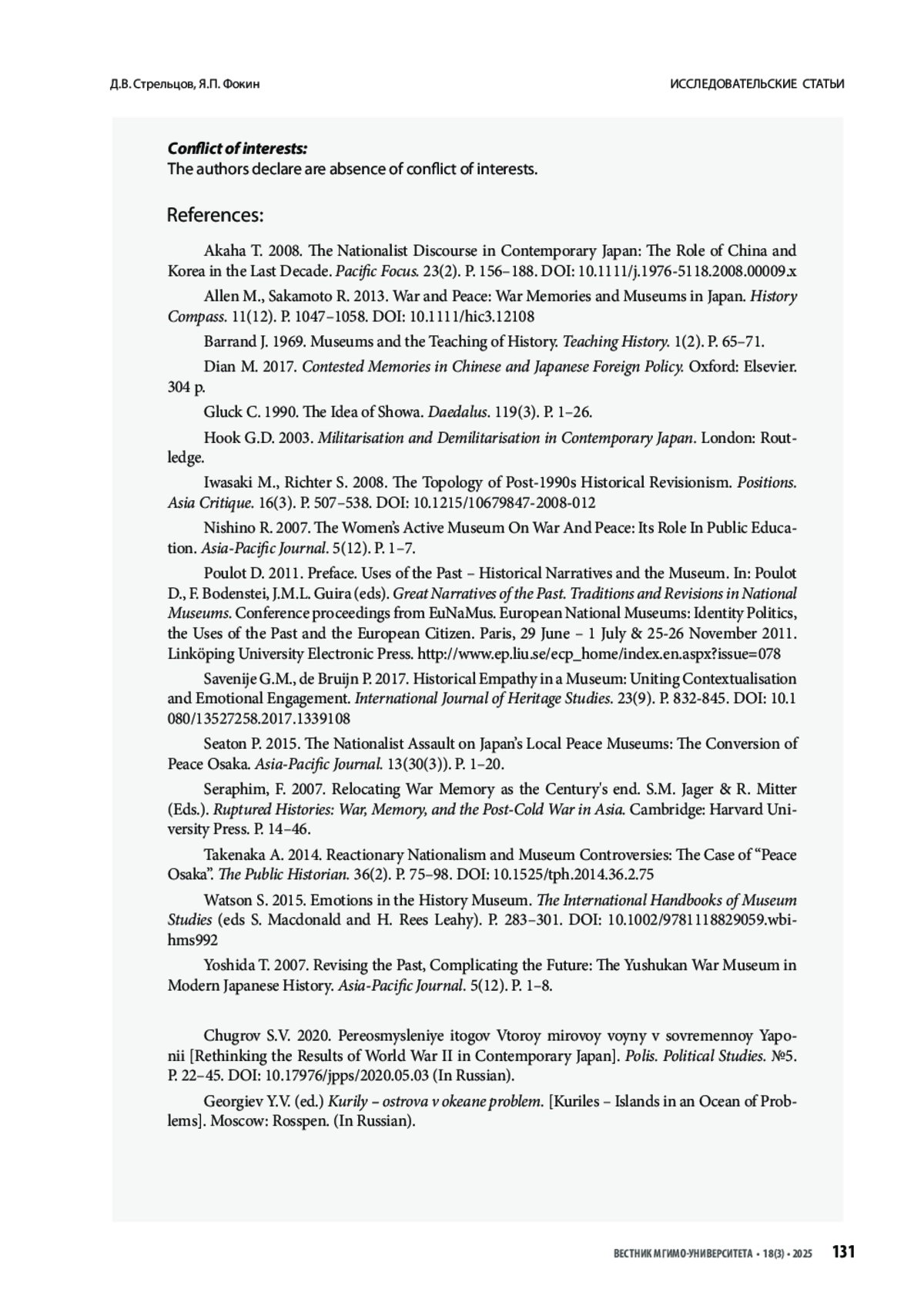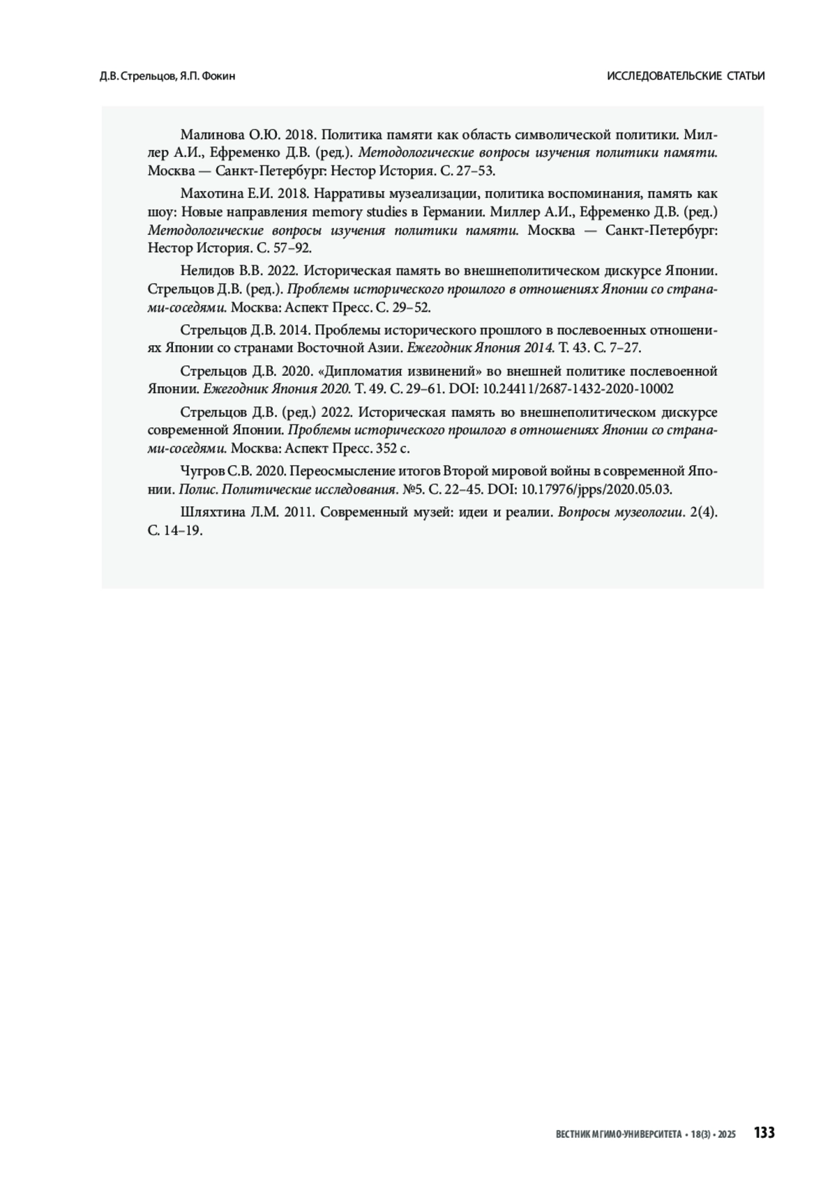 СТРЕЛЬЦОВ Д. В., ФОКИН Я. П. НАРРАТИВЫ ТРАВМАТИЧЕСКОГО ПРОШЛОГО В ЯПОНСКИХ МУЗЕЯХ ИСТОРИЧЕСКОЙ ПАМЯТИ // ВЕСТНИК МГИМО-УНИВЕРСИТЕТА. 2025. ТОМ 18, № 3