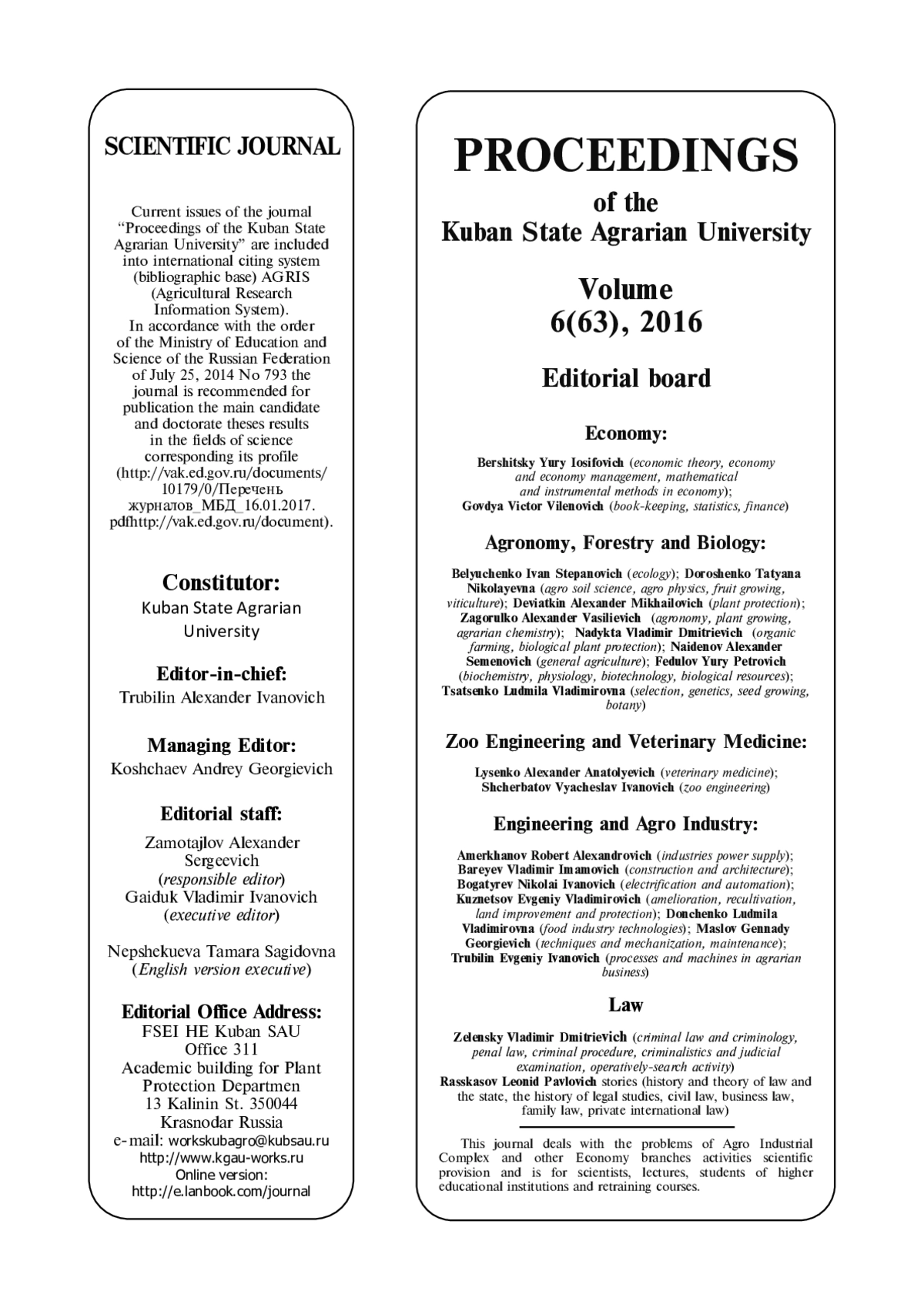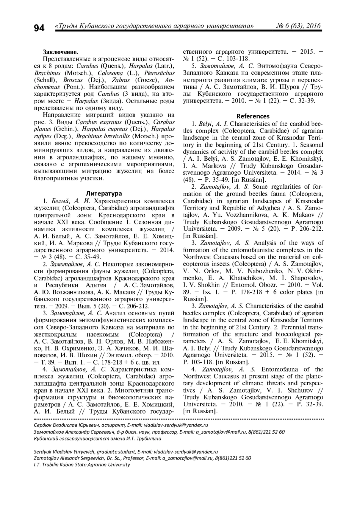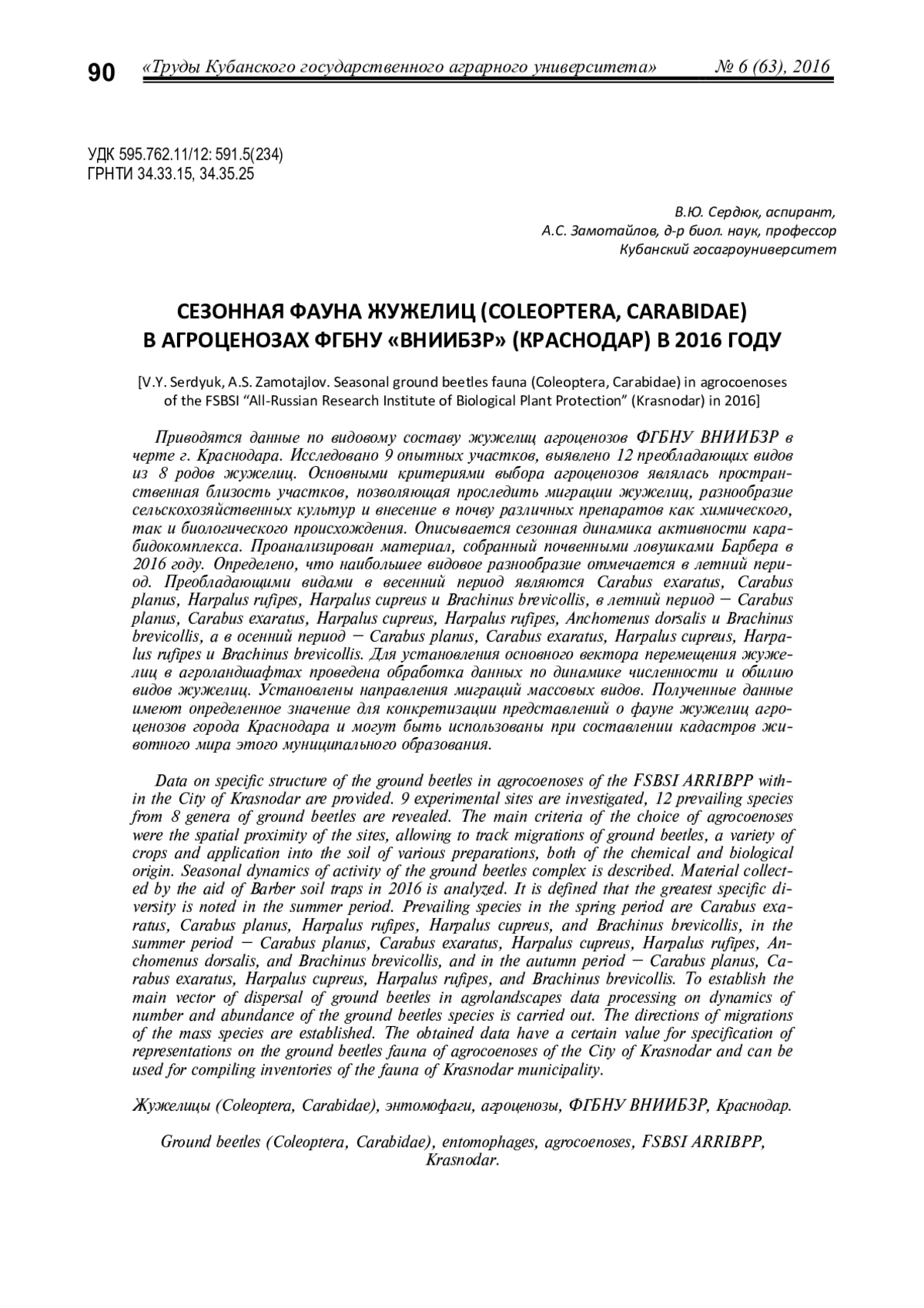 СЕРДЮК В. Ю., ЗАМОТАЙЛОВ А. С. СЕЗОННАЯ ФАУНА ЖУЖЕЛИЦ (COLEOPTERA, CARABIDAE) В АГРОЦЕНОЗАХ ФГБНУ "ВНИИБЗР" (КРАСНОДАР) В 2016 ГОДУ