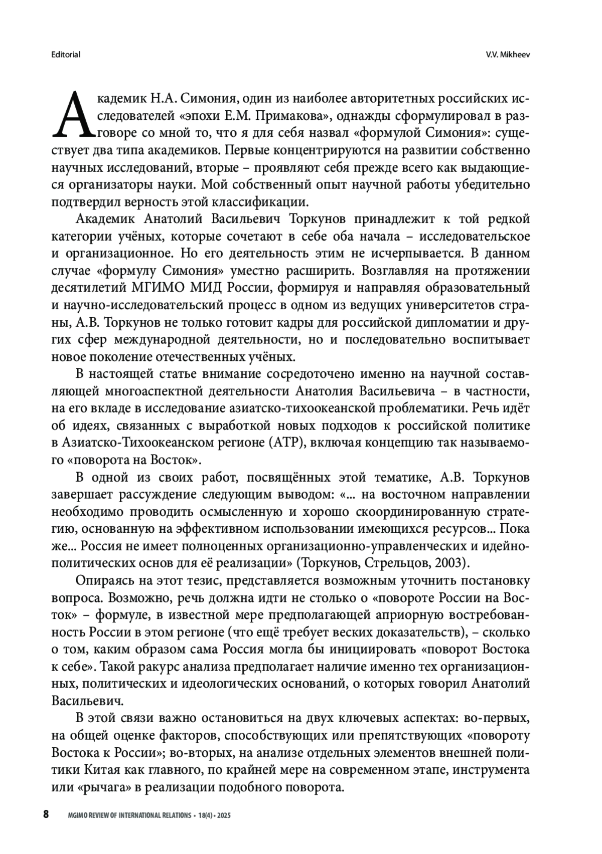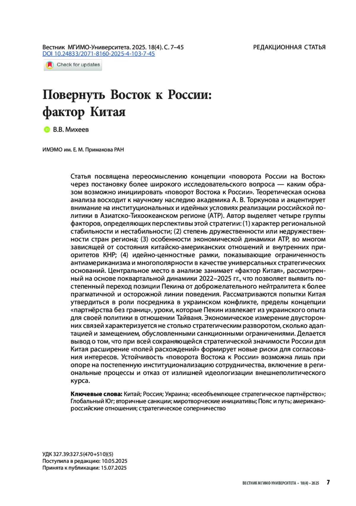 Статья посвящена переосмыслению концепции «поворота России на Восток» через постановку более широкого исследовательского вопроса — каким образом возможно инициировать «поворот Востока к России». Теоретическая основа анализа восходит к научному наследию академика А. В. Торкунова и акцентирует внимание на институциональных и идейных условиях реализации российской политики в Азиатско-Тихоокеанском регионе (АТР). Автор выделяет четыре группы факторов, определяющих перспективы этой стратегии: (1) характер региональной стабильности и нестабильности; (2) степень дружественности или недружественности стран региона; (3) особенности экономической динамики АТР, во многом зависящей от состояния китайско-американских отношений и внутренних приоритетов КНР; (4) идейно-ценностные рамки, показывающие ограниченность антиамериканизма и многополярности в качестве универсальных стратегических оснований. Центральное место в анализе занимает «фактор Китая», рассмотренный на основе поквартальной динамики 2022–2025 гг., что позволяет выявить постепенный переход позиции Пекина от доброжелательного нейтралитета к более прагматичной и осторожной линии поведения. Рассматриваются попытки Китая утвердиться в роли посредника в украинском конфликте, пределы концепции «партнёрства без границ», уроки, которые Пекин извлекает из украинского опыта для своей политики в отношении Тайваня. Экономическое измерение двусторонних связей характеризуется не столько стратегическим разворотом, сколько адаптацией и замещением, обусловленными санкционными ограничениями. Делается вывод о том, что при всей сохраняющейся стратегической значимости России для Китая расширение «полей расхождений» формирует новые риски для согласования интересов. Устойчивость «поворота Востока к России» возможна лишь при опоре на постепенную институционализацию сотрудничества, включение в региональные процессы и отказ от излишней идеологизации внешнеполитического курса.