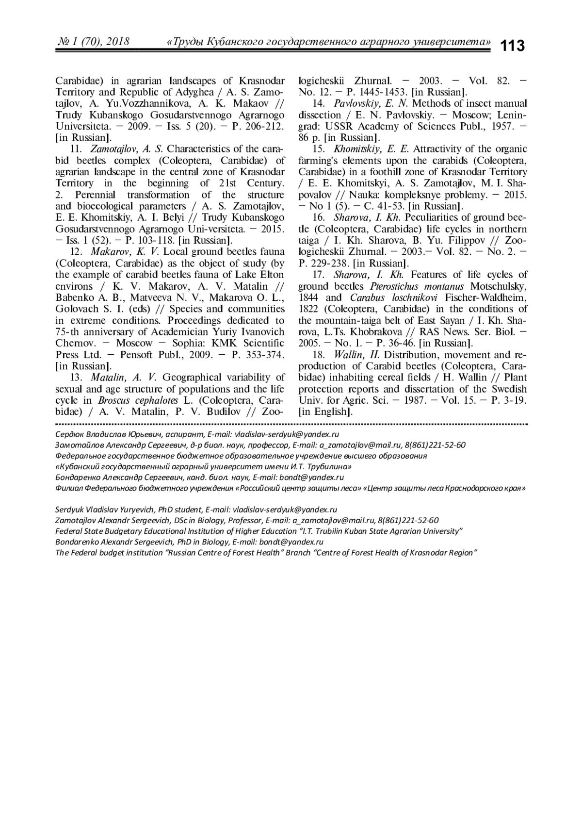 Приводятся данные по сезонной динамике активности и демографической структуре популяций жужелиц Carabus exaratus и C. cumanus в условиях лиманно-плавневого природного комплекса Северо-Западного Кавказа (Славянский район Краснодарского края). По результатам сбора имаго жужелиц почвенными ловушками Барбера-Гейдемана и изучения состояния их репродуктивной системы реконструированы сезонная динамика активности и жизненные циклы двух массовых видов жужелиц трибы Carabini. Проведено сравнение с данными возрастной структуры популяций C. exaratus и C. cumanus из других зон Краснодарского края. Установлено, что жизненный цикл у С. exaratus и C. cumanus является одногодичным. Для C. exaratus характерно летне-осеннее размножение с зимующими постгенеративными имаго, а для C. сumanus - весенне-летнее с зимующими в большей степени постгенеративными и имматурными особями. У C. exaratus на протяжении 2016-2017 гг. наблюдалось незначительное численное преобладание самок над самцами, у C. cumanus в 2016 г. с небольшим перевесом доминировали самки, а в следующем году - самцы.
