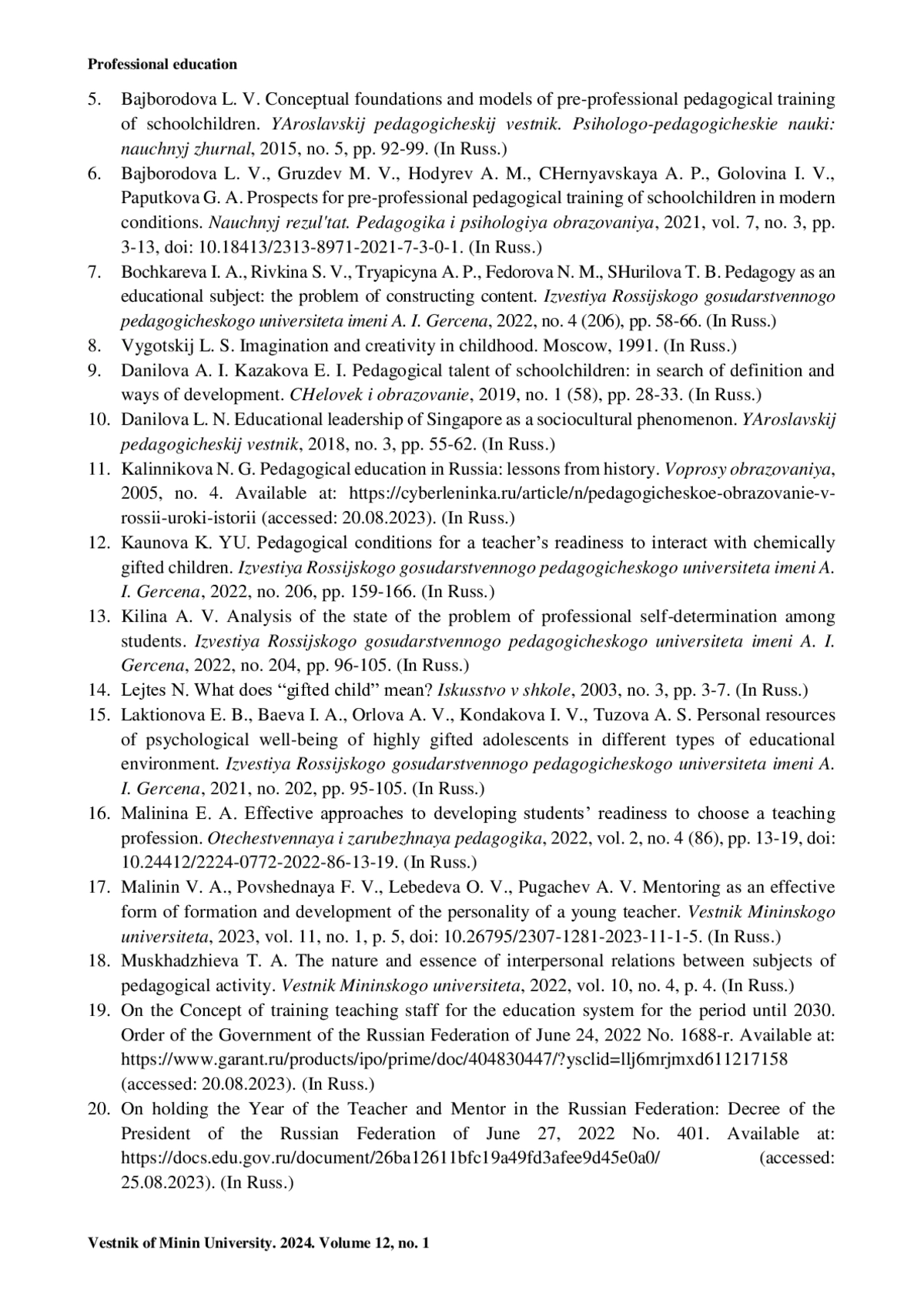 5. Байбородова Л. В. Концептуальные основы и модели допрофессиональной педагогической подготовки школьников // Ярославский педагогический вестник. Психолого-педагогические науки: научный журнал. 2015. № 5. С. 92-99.