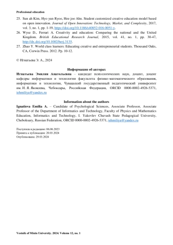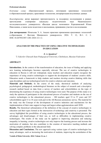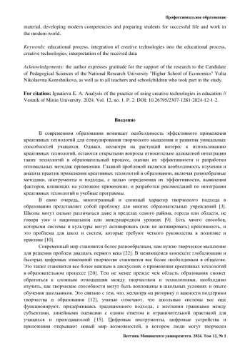 ИГНАТЬЕВА Э. А. АНАЛИЗ ПРАКТИКИ ПРИМЕНЕНИЯ КРЕАТИВНЫХ ТЕХНОЛОГИЙ В ОБРАЗОВАНИИ // ВЕСТНИК МИНИНСКОГО УНИВЕРСИТЕТА. 2024. ТОМ 12, № 1