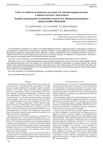 5. Борукаев Т.А., Саламов А.Х. Ароматические полиамиды с триарилметановыми фрагментами в основной цепи // Пласт. массы. 2024. №4. С. 16-19.