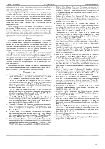 6. Cho J. D., Hong J. W. UV-initiated free radical and cationic photopolymerizations of acrylate /epoxide and acrylate / vinyl ether hybrid systems with and without photosensitizer // J. Appl. Polym. Sci. 2004. 93(3). PP. 1473-1483. DOI: 10.1002/app.20597