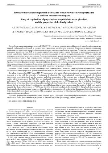 25. Абдувохидов И.К., Жураев А.Б., Алимухамедов М.Г., Магрупов Ф.А. Влияние условий проведения алкоголиза вторичного полиэтилентерефталата на выход бисгидроксиэтилтерефталата // Химия и химическая технология. 2019. №4. С. 54-57.