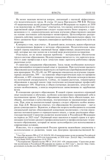 В рамках данного исследования предпринята попытка проанализировать особенности реализации государственной политики КНР в деле развития системы образования. Сфера образования занимает особое место в программе модернизации Китая, и эффективность ее функционирования рассматривается как одно из базовых условий обеспечения социально-экономического благополучия. Законы об образовании, принятые в конце 1990-х гг., определили основные рамки, в которых реализуется образовательная политика. На их основе разработан ряд специальных программ развития направлений и уровней образования. Пятилетние планы выступают как основной программный документ, который определяет целевые показатели социально-экономического развития. В рамках данной статьи изучены пятилетние планы с 2001 по 2025 г. в части развития системы образования. Выявлено, что основными задачами в указанный период были обеспечение доступности среднего образования, выравнивание региональных диспропорций в развитии образования, создание условий для образования в течение всей жизни. В программах 13-го и 14-го пятилетних планов отдельное внимание уделено расширению образовательного влияния на международном уровне; высшее образование рассматривается как особое направление внешней политики современного Китая.