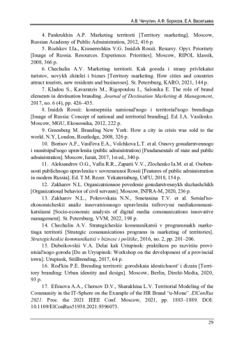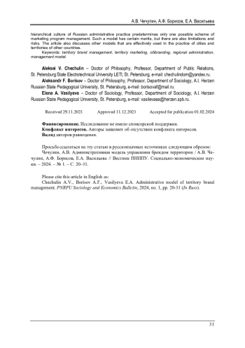 ЧЕЧУЛИН А. В., БОРИСОВ А. Ф., ВАСИЛЬЕВА Е. А. АДМИНИСТРАТИВНАЯ МОДЕЛЬ УПРАВЛЕНИЯ БРЕНДОМ ТЕРРИТОРИИ // ВЕСТНИК ПЕРМСКОГО НАЦИОНАЛЬНОГО ИССЛЕДОВАТЕЛЬСКОГО ПОЛИТЕХНИЧЕСКОГО УНИВЕРСИТЕТА. СОЦИАЛЬНО-ЭКОНОМИЧЕСКИЕ НАУКИ. 2024. № 1