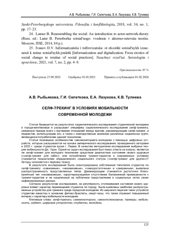 РЫБЬЯКОВА А. В., СЕЛЕТКОВА Г. И., ЛАЗУКОВА Е. А., ТУЛИЕВА К. В. СЕЛФ-ТРЕКИНГ В УСЛОВИЯХ МОБИЛЬНОСТИ СОВРЕМЕННОЙ МОЛОДЕЖИ // ВЕСТНИК ПЕРМСКОГО НАЦИОНАЛЬНОГО ИССЛЕДОВАТЕЛЬСКОГО ПОЛИТЕХНИЧЕСКОГО УНИВЕРСИТЕТА. СОЦИАЛЬНО-ЭКОНОМИЧЕСКИЕ НАУКИ. 2024. № 1