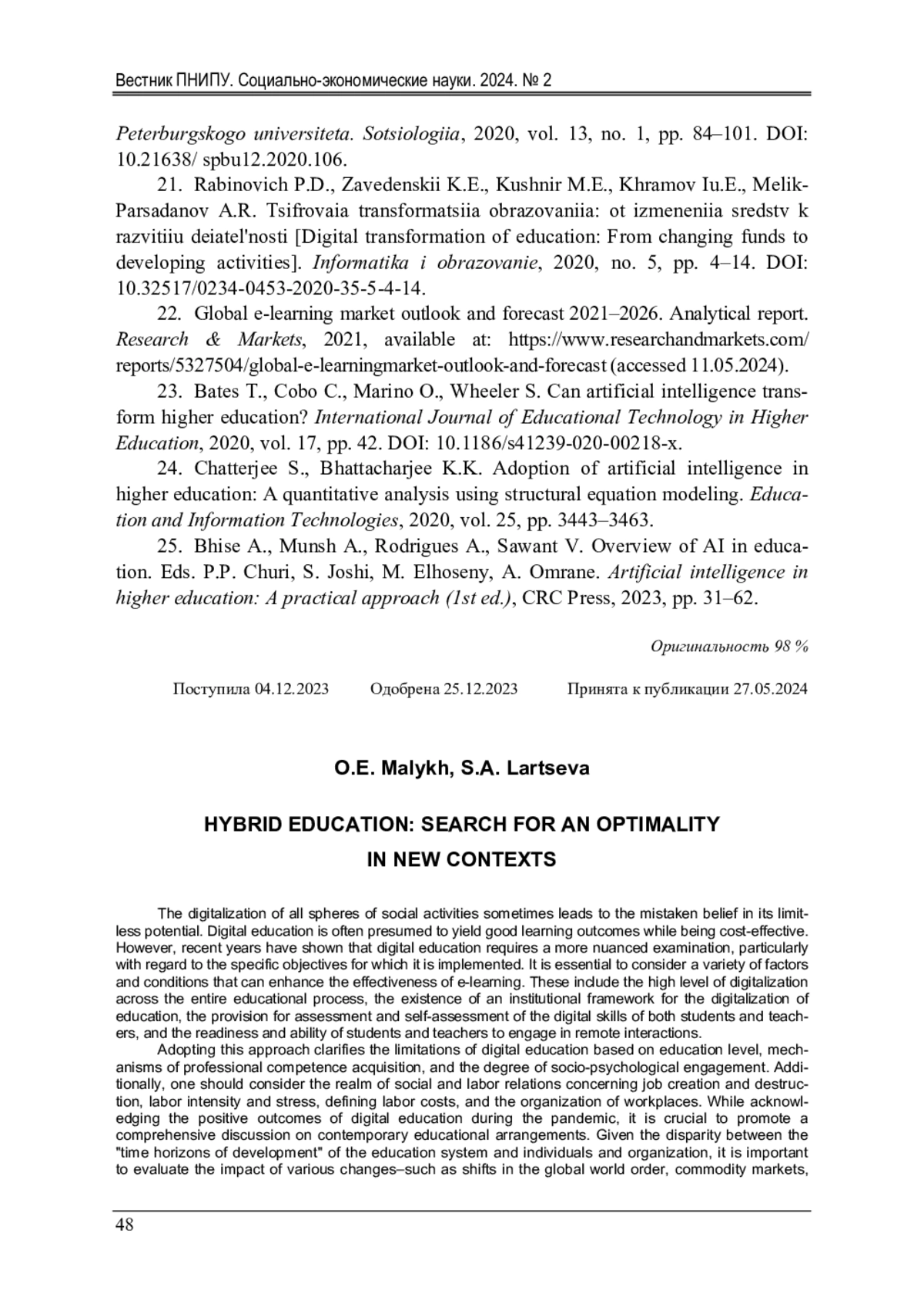 20. Минина, В.Н. Цифровизация высшего образования и ее социальные результаты / В.Н. Минина // Вестник Санкт-Петербургского университета. Социология. - 2020. - T. 13, № 1. - С. 84-101. 10.21638/ spbu12.2020.106. DOI: 10.21638/spbu12.2020.106 EDN: TSZWMF
