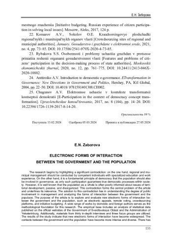 Существует определенное противоречие: с одной стороны, региональное и муниципальное управление должны осуществлять компетентные лица, обладающие специальным образованием и опытом работы. С другой, аксиомой является утверждение, что население также должно привлекаться к управлению, поскольку только такое участие гарантирует демократичность общества. При этом известно, что население в целом слабо информировано о проблемах развития территории, пассивно и не организовано. Это противоречие является базовой проблемой статьи и показывает ее актуальность. Разрешение противоречия лежит в понимании степени вовлечения населения к управлению и анализе форм взаимодействия власти и населения. Цель статьи - исследовать новые электронные формы взаимодействия власти и населения (электронные обращения, дистанционное голосование, краудсорсинговые платформы, инициативное бюджетирование) и дать им оценку. В качестве методологической базы в работе использовался широкий круг работ отечественных и зарубежных авторов. Эмпирическую базу составляет анализ статистических данных, опубликованных на официальных сайтах правительства Свердловской области и администрации муниципального образования город Екатеринбург. Также используются материалы 30 глубинных интервью и 3 фокус-групп. Результаты исследования показывают, что новые электронные формы взаимодействия получили широкое распространение. Контакты власти и населения стали более интенсивными и разнообразными. От практики информирования и консультирования намечается движение в сторону вовлечения населения в процесс распределения части бюджетных средств. В целом повышается прозрачность информационно-цифровых коммуникаций власти и населения.