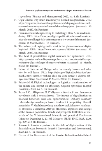 12. Малолетов Д.А., Угнич Е.А. Риски развития цифровой экономики и пути их снижения: опыт России / Современная мировая экономика: вызовы и реальность: сб. материалов VII Междунар. науч.-практ. конф., г. Донецк, 10 декабря 2024 г. / Ред. кол.: А. Я. Аноприенко, А. В. Половян, Н. Ю. Омарова [и др.]; отв. ред. Г. А. Шавкун. Донецк: ДонНТУ, 2025. С. 156-159. EDN: OQJIYV