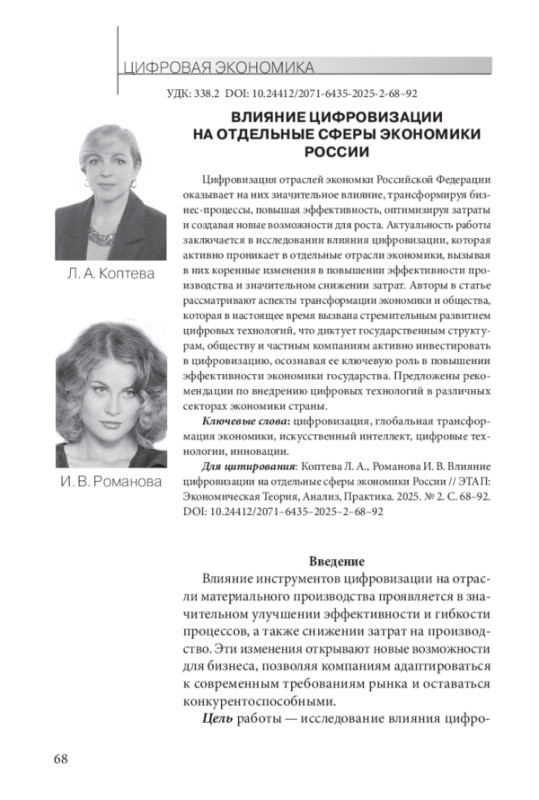 Цифровизация отраслей экономки Российской Федерации оказывает на них значительное влияние, трансформируя бизнес-процессы, повышая эффективность, оптимизируя затраты и создавая новые возможности для роста. Актуальность работы заключается в исследовании влияния цифровизации, которая активно проникает в отдельные отрасли экономики, вызывая в них коренные изменения в повышении эффективности производства и значительном снижении затрат. Авторы в статье рассматривают аспекты трансформации экономики и общества, которая в настоящее время вызвана стремительным развитием цифровых технологий, что диктует государственным структурам, обществу и частным компаниям активно инвестировать в цифровизацию, осознавая ее ключевую роль в повышении эффективности экономики государства. Предложены рекомендации по внедрению цифровых технологий в различных секторах экономики страны.