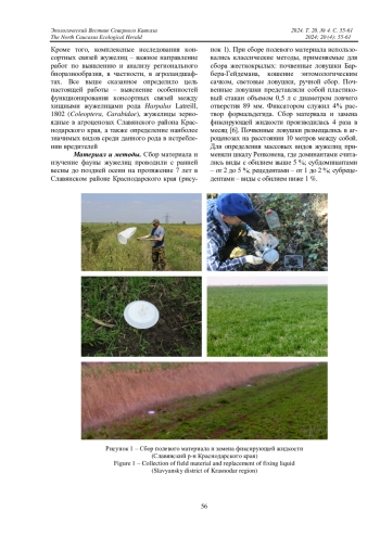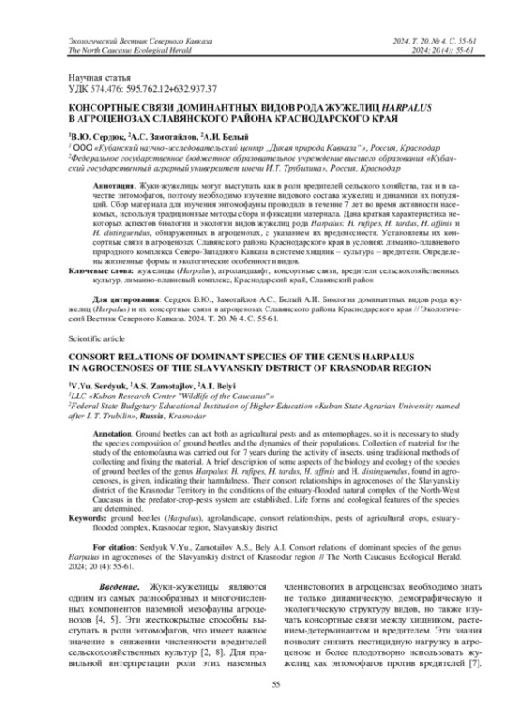 7. Сердюк В.Ю., Замотайлов А.С., Бондаренко А.С. Жизненные формы, экологическая приуроченность и ареалогическая характеристика жужелиц (Coleoptera, Carabidae) агроландшафта в условиях лиманно-плавневого природного комплекса северо-Западного Кавказа // Труды Кубанского государственного аграрного университета. 2019. Вып. 1 (76). С. 147-154. DOI: 10.21515/1999-1703-76-147-154 EDN: RSVVZG