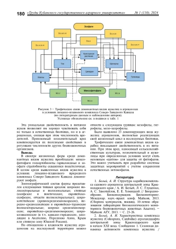 Целью настоящей работы являлось определение особенностей формирования трофических связей и пищевой специализации доминантных видов жужелиц агроценозов Славянского и части Темрюкского районов Краснодарского края, а также выявление основных повреждаемых культур и мест их локализации. Установлено, что среди массовых видов встречаются как зоофаги, так и миксофитофаги. Карабидокомплекс агроценозов лиманно-плавневой территории представлен 23 доминирующими видами, полностью реализующими свой жизненный цикл в исследуемых биотопах: Carabus cumanus, C. campestris, C. exaratus, Poecilus cupreus, Pterostichus niger, Сalathus distinguendus, C. fuscipes, C. erratus, C. melanocephalus, C. halensis, Amara aenea, A. lucida, Zabrus tenebrioides, Harpalus rufipes, H. tardus, H. affinis, H. distinguendus, Ophonus azureus, Callistus lunatus, Dinodes decipiens, Chlaenius aeneocephalus, Ch. nitidulus, Brachinus crepitans. Преобладали миксофитофаги геохортобионты гарпалоидные и зоофаги стратобионты скважники подстилочные. Тем не менее, из общего количества выявленных видов жужелиц доминируют зоофаги. Среди обнаруженных доминантных видов в агроценозах встречаются вредители сельскохозяйственных культур, требующие разработки защитных мероприятий. Зоогеографический анализ выявил широкие полисекторальные и полизональные, степные, европейско-скифские, широкотетийские, передне-среднеазиатские, европейско-туранские полисекторальные, широкосредиземноморские, европейско-средиземноморские и широкоэвксинские ареалы. По отношению к влажности карабидокомплекс представлен мезофилами, мезо-ксерофилами, гигрофилами.