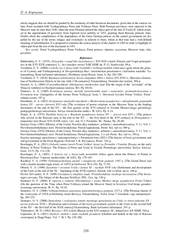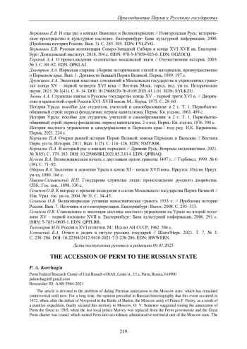 Статья посвящена проблеме датировки присоединения Перми Великой к Московскому государству, которая до сих пор оставалась дискуссионной. В российской историографии долго господствовало мнение, что это событие произошло в 1472 г., когда после поражения Новгорода в Шелонской битве московская рать князя Ф. Пестрого в результате карательной экспедиции окончательно закрепила эту территорию за Москвой. О. В. Семенов предложил приурочивать момент присоединения Перми Великой к 1505 г., когда с Пермского наместничества был сведен последний местный династ князя Матвей и выпущена Великопермская уставная наместническая грамота, превращавшая Пермь в обычную административно-территориальную единицу Московского государства. В статье предлагается руководствоваться показаниями иных исторических документов, учитывая, что в источниках хороним Пермь включал в себя и Пермь Вычегодскую, и Пермь Великую. Обе Перми были присоединены к Московскому государству не позднее 1449 г., когда термин Пермский попал в объектную часть титула Василия II, выражением и следствием чего стало назначение в 1451 г. в них наместников из крещеной местной знати с признанием за ними русских княжеских титулов. Сомнения в полноте зависимости великопермских князей от центральной власти развеиваются употреблением применительно к ним терминов «слуга» и «вотчич», имевших в то время вполне определенное значение подчиненности. Предлагается продолжить источниковедческий анализ уставной грамоты 1505 г. для выделения из текста документа ее древнейшей части 1451 г.