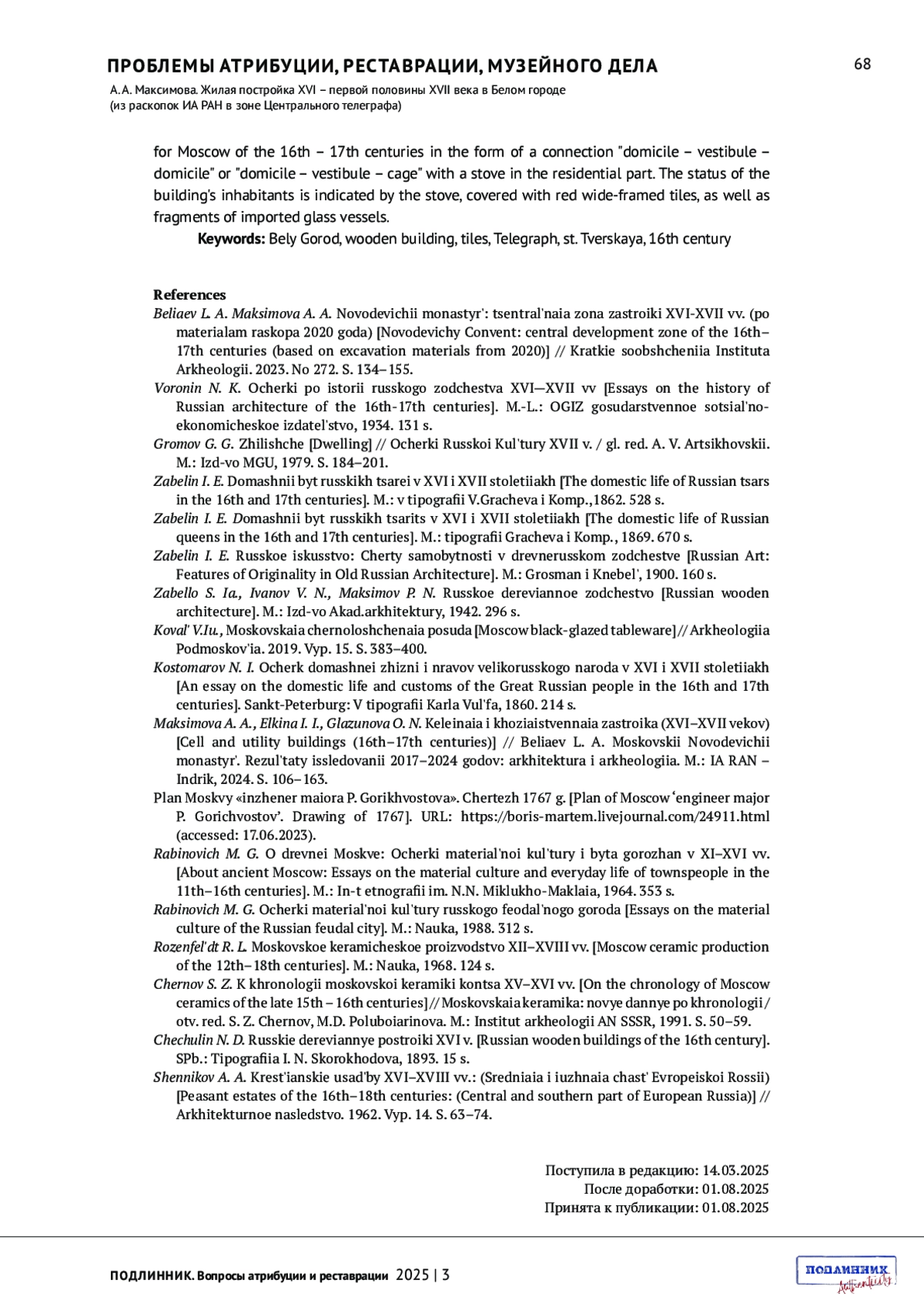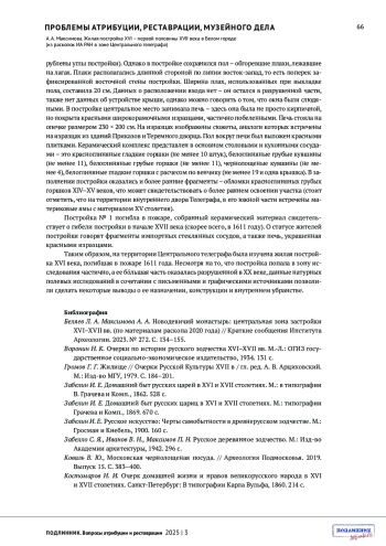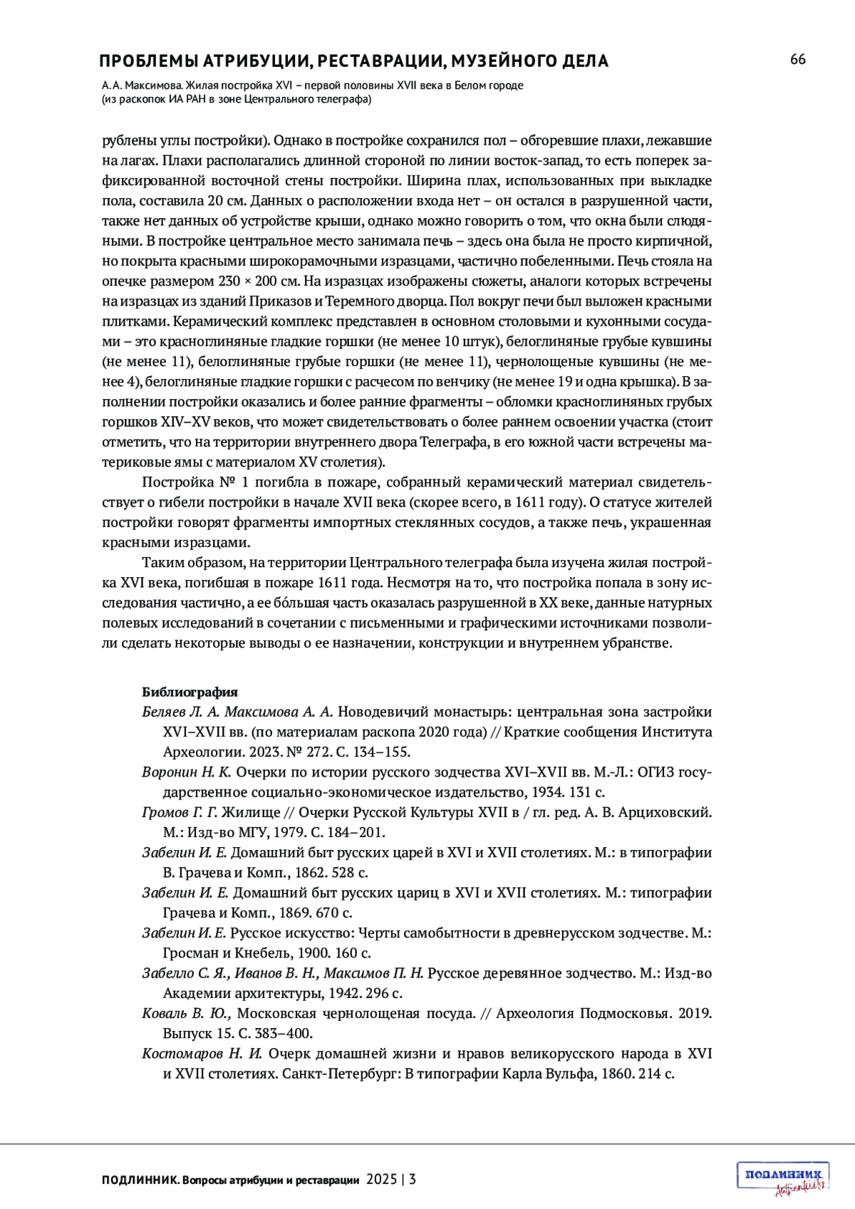 1. Беляев Л. А. Максимова А. А. Новодевичий монастырь: центральная зона застройки XVI-XVII вв. (по материалам раскопа 2020 года) // Краткие сообщения Института Археологии. 2023. № 272. С. 134-155.