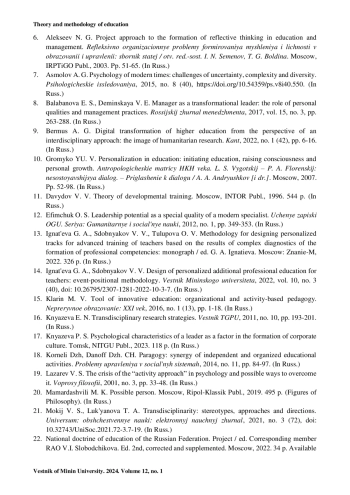 8. Балабанова Е. С., Деминская В. Э. Руководитель как трансформационный лидер: роль личностных качеств и управленческих практик // Российский журнал менеджмента. 2017. Т. 15, № 3. С. 263-288.