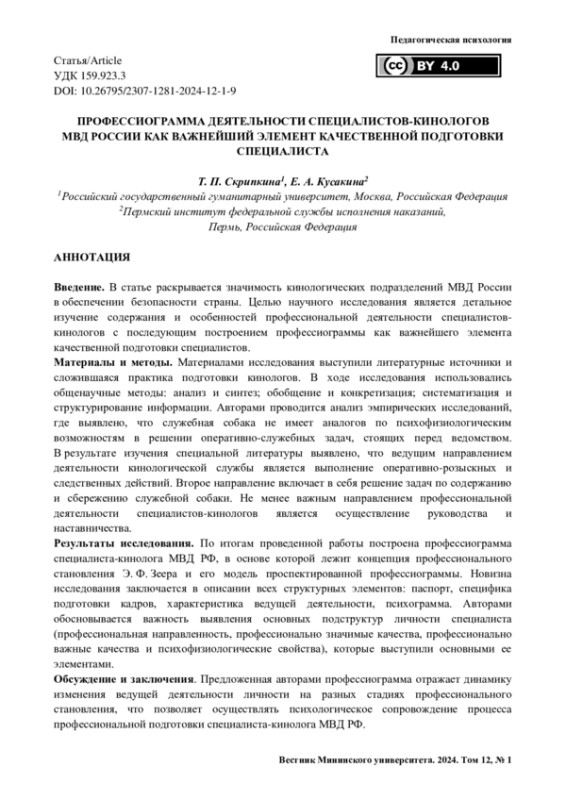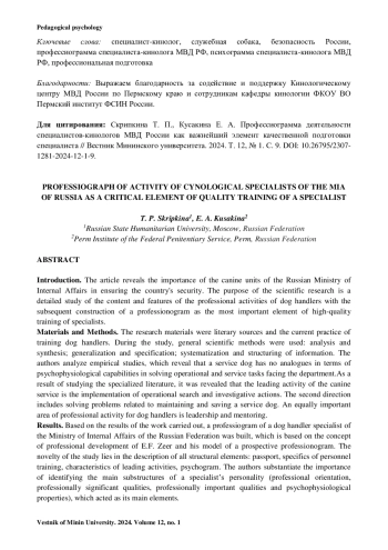 Результаты исследования. По итогам проведенной работы построена профессиограмма специалиста-кинолога МВД РФ, в основе которой лежит концепция профессионального становления Э. Ф. Зеера и его модель проспектированной профессиограммы. Новизна исследования заключается в описании всех структурных элементов: паспорт, специфика подготовки кадров, характеристика ведущей деятельности, психограмма. Авторами обосновывается важность выявления основных подструктур личности специалиста (профессиональная направленность, профессионально значимые качества, профессионально важные качества и психофизиологические свойства), которые выступили основными ее элементами.
