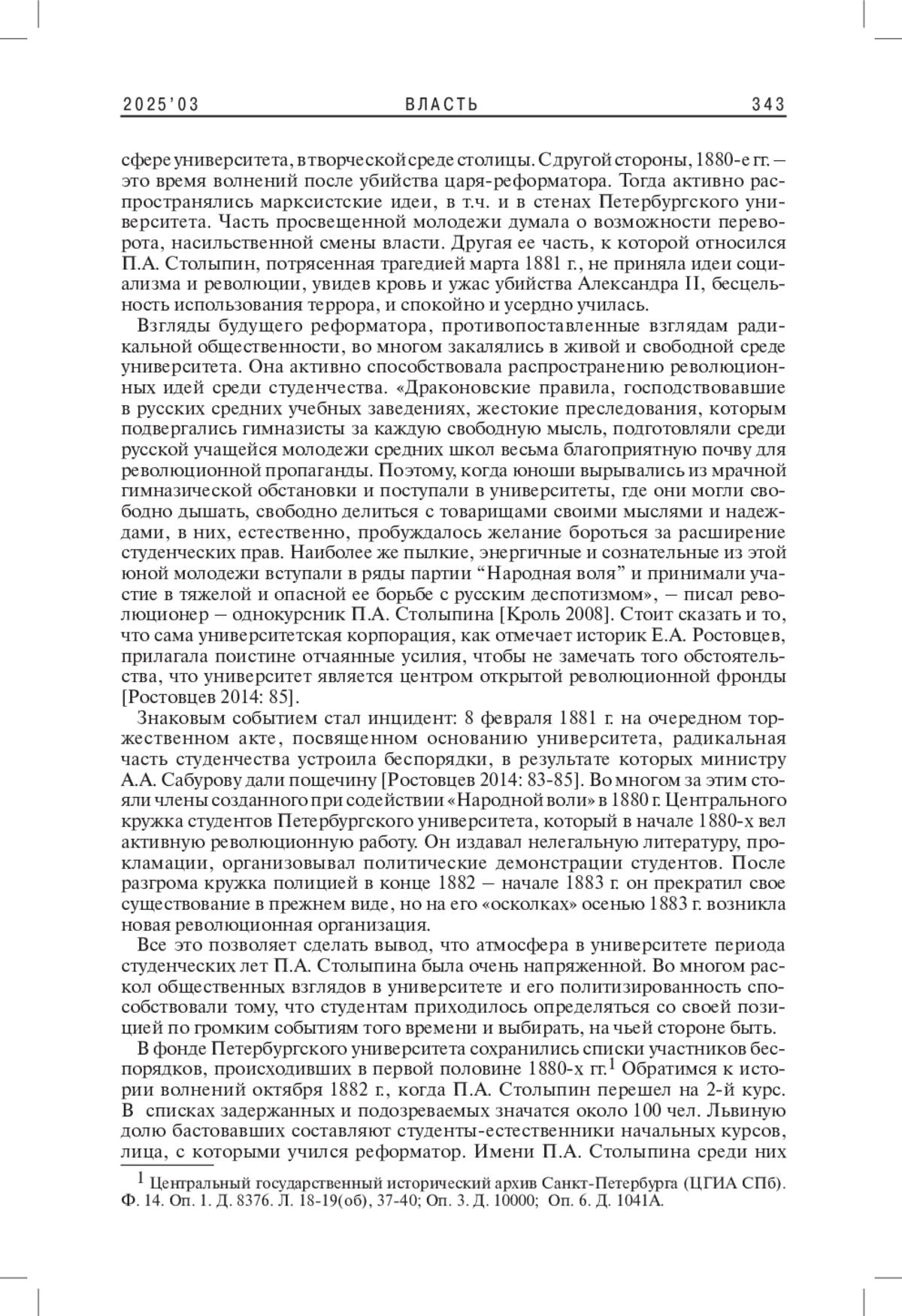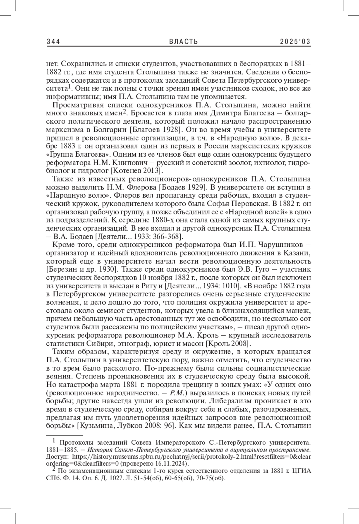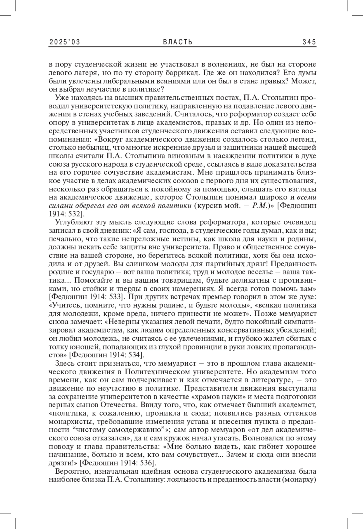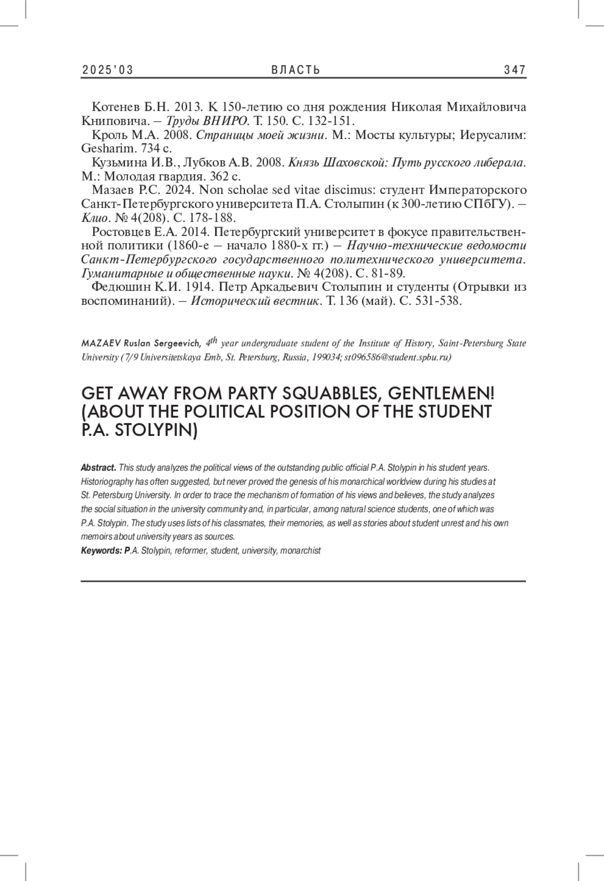МАЗАЕВ Р. С. УХОДИТЕ ОТ ПАРТИЙНЫХ ДРЯЗГ, ГОСПОДА! (О ПОЛИТИЧЕСКОЙ ПОЗИЦИИ СТУДЕНТА П. А. СТОЛЫПИНА) // ВЛАСТЬ. 2025. ТОМ 33 № 3