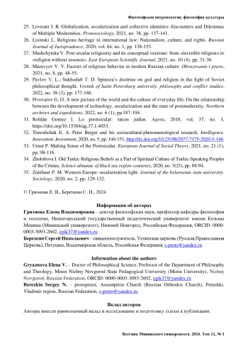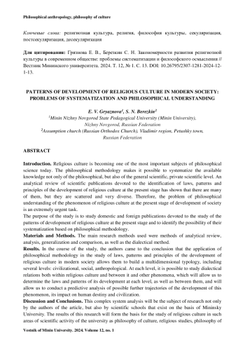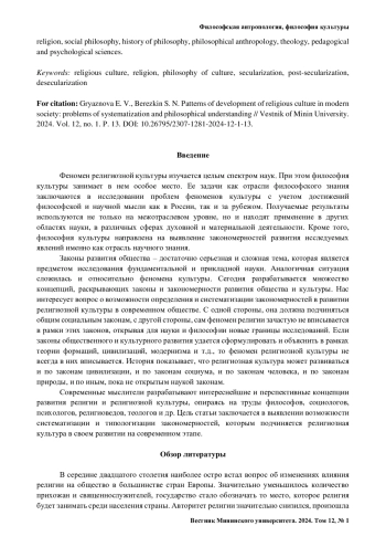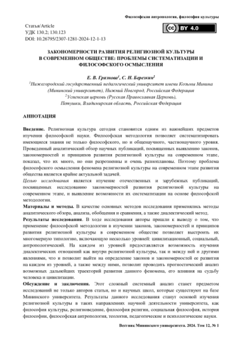 ГРЯЗНОВА Е. В., БЕРЕЗКИН С. Н. ЗАКОНОМЕРНОСТИ РАЗВИТИЯ РЕЛИГИОЗНОЙ КУЛЬТУРЫ В СОВРЕМЕННОМ ОБЩЕСТВЕ: ПРОБЛЕМЫ СИСТЕМАТИЗАЦИИ И ФИЛОСОФСКОГО ОСМЫСЛЕНИЯ // ВЕСТНИК МИНИНСКОГО УНИВЕРСИТЕТА. 2024. ТОМ 12, № 1