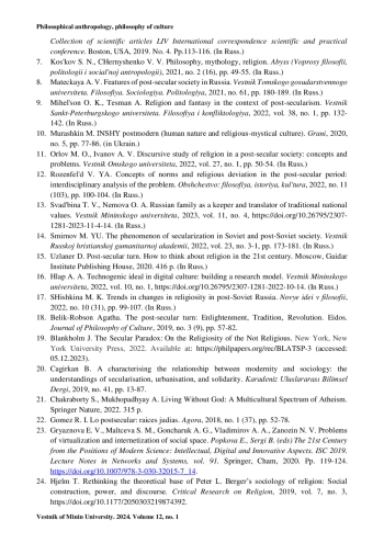 Ключевые фразы: РЕЛИГИОЗНАЯ КУЛЬТУРА, религия, философия культуры, СЕКУЛЯРИЗАЦИЯ, постсекуляризация, десекуляризация