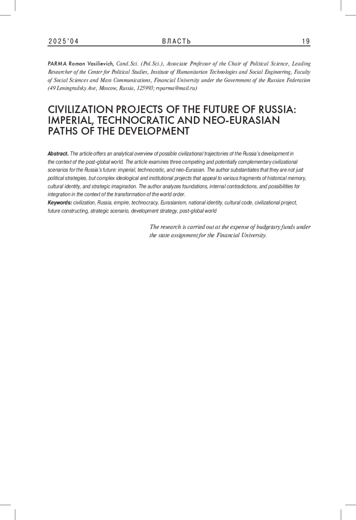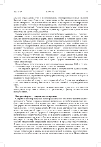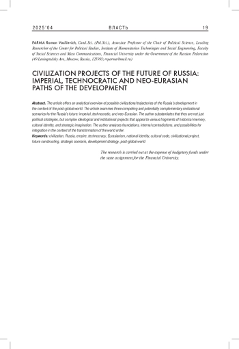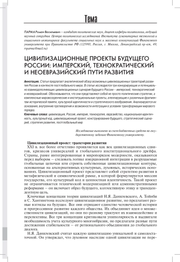 Статья предлагает аналитический обзор возможных цивилизационных траекторий развития России в контексте постглобального мира. В статье исследуются три конкурирующих и потенциально взаимодополняющих цивилизационных сценария будущего России - имперский, технократический и неоевразийский. Обосновывается, что они представляют собой не просто политические стратегии, а комплексные мировоззренческие и институциональные проекты, апеллирующие к различным фрагментам исторической памяти, культурной идентичности и стратегического воображения. Анализируются их основания, внутренние противоречия и возможности интеграции в условиях трансформации мирового порядка.