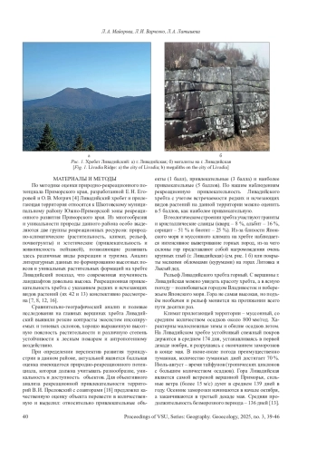 Приморский край входит в Дальневосточный рекреационный район. В рекреационном отношении освоен сравнительно слабо, хотя и обладает богатым природно-рекреационным потенциалом [4]. Муссонный климат, своеобразный рельеф, тихоокеанские берега, уникальный растительный и животный мир придают Ливадийскому хребту и прилегающей территории неповторимый колорит, а природные комплексы, обладающие уникальной природой и благоприятным климатом, являются хорошими объектами для развития различных видов познавательного и экологического туризма. Б. А. Воронов с соавторами, определяя термин «экологический туризм» как путешествие среди природы, выделяет три основных вида экологического туризма: научный, познавательный, рекреационный [17].