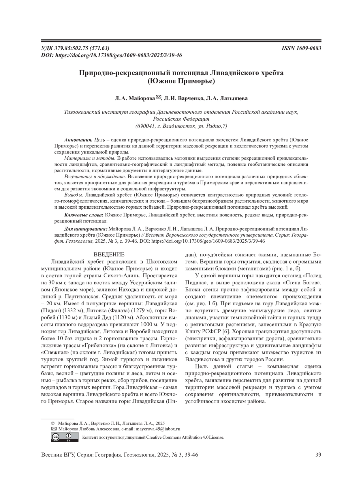 12. Леусов А. Е., Малюгин А. В., Сазыкин А. М. Особенности и перспективы рекреационного освоения Ливадийского хребта II Записки Общества изучения Амурского края, 2020, т XLVI, с. 63-68.