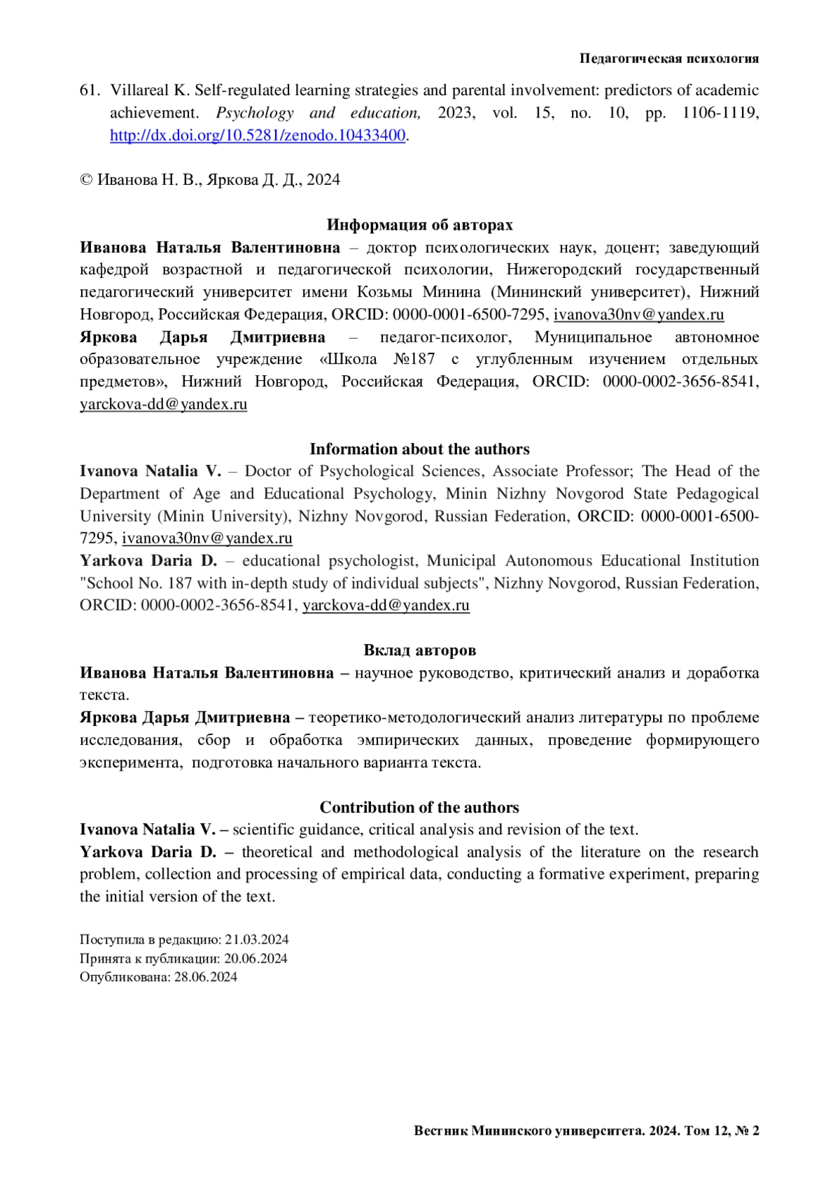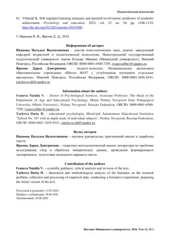61. Villareal K. Self-regulated learning strategies and parental involvement: predictors of academic achievement // Psychology and education. 2023. Vol. 15, no. 10. Pp. 1106-1119. https://doi.org/10.5281/zenodo.10433400.